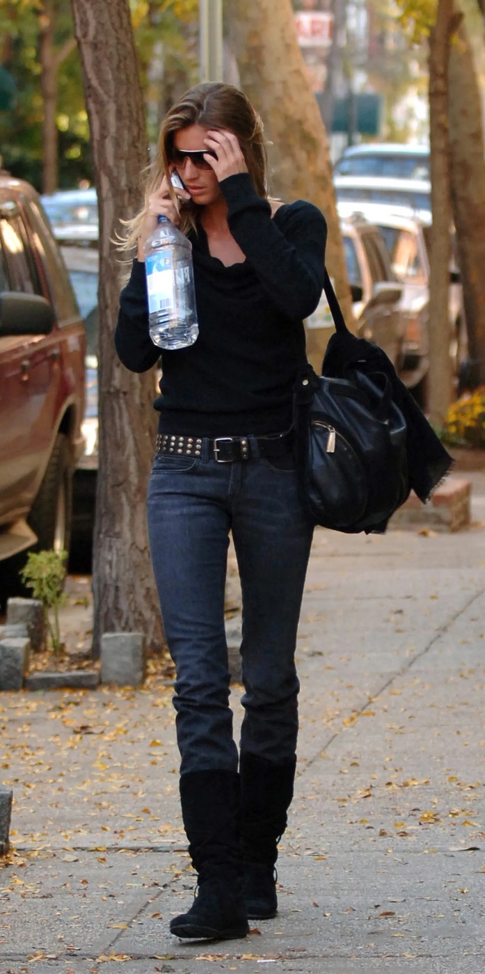 사실, 스터드 벨트에 대해서는 확신이 없었습니다. 이 아이템이 다시 예뻐 보일 날이 과연 오기나 할지, 회의적인 입장이었죠. 하지만 지젤이 로우 라이즈 청바지, 초대형 선글라스, 그리고 두툼한 2G폰과 함께 스터드 벨트를 매치한 사진을 보고 생각이 바뀌었습니다. 잘만 조합한다면 충분히 훌륭한 아이템이더군요. 하지만 이 룩의 진짜 주인공은 따로 있습니다. 바로 검은색 플랫 스웨이드 부츠입니다.