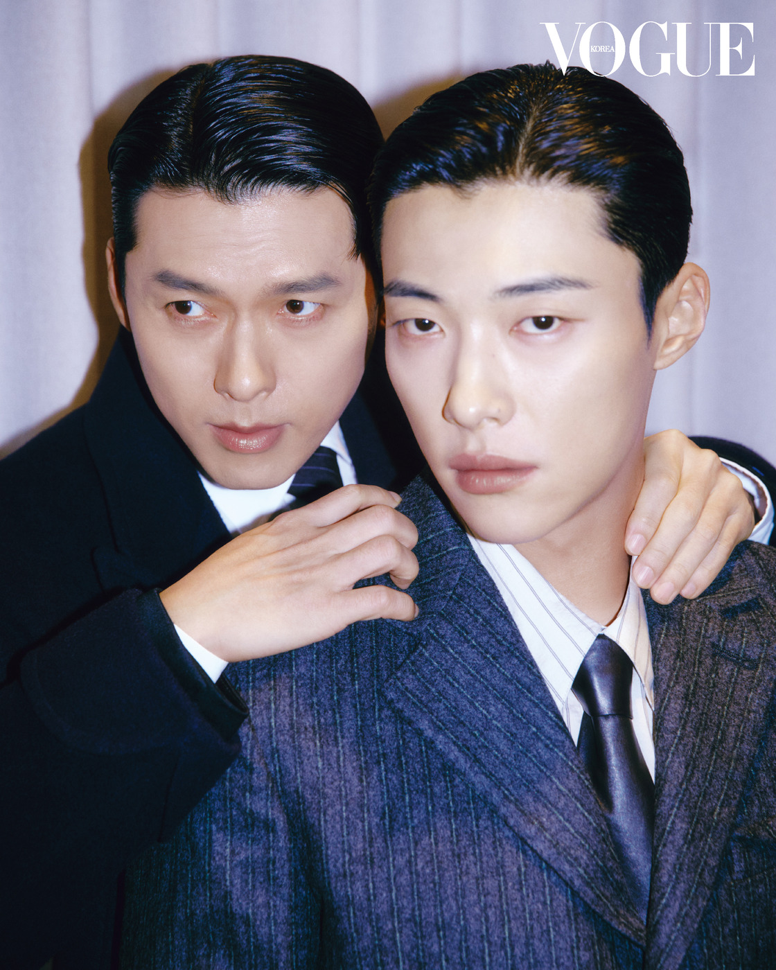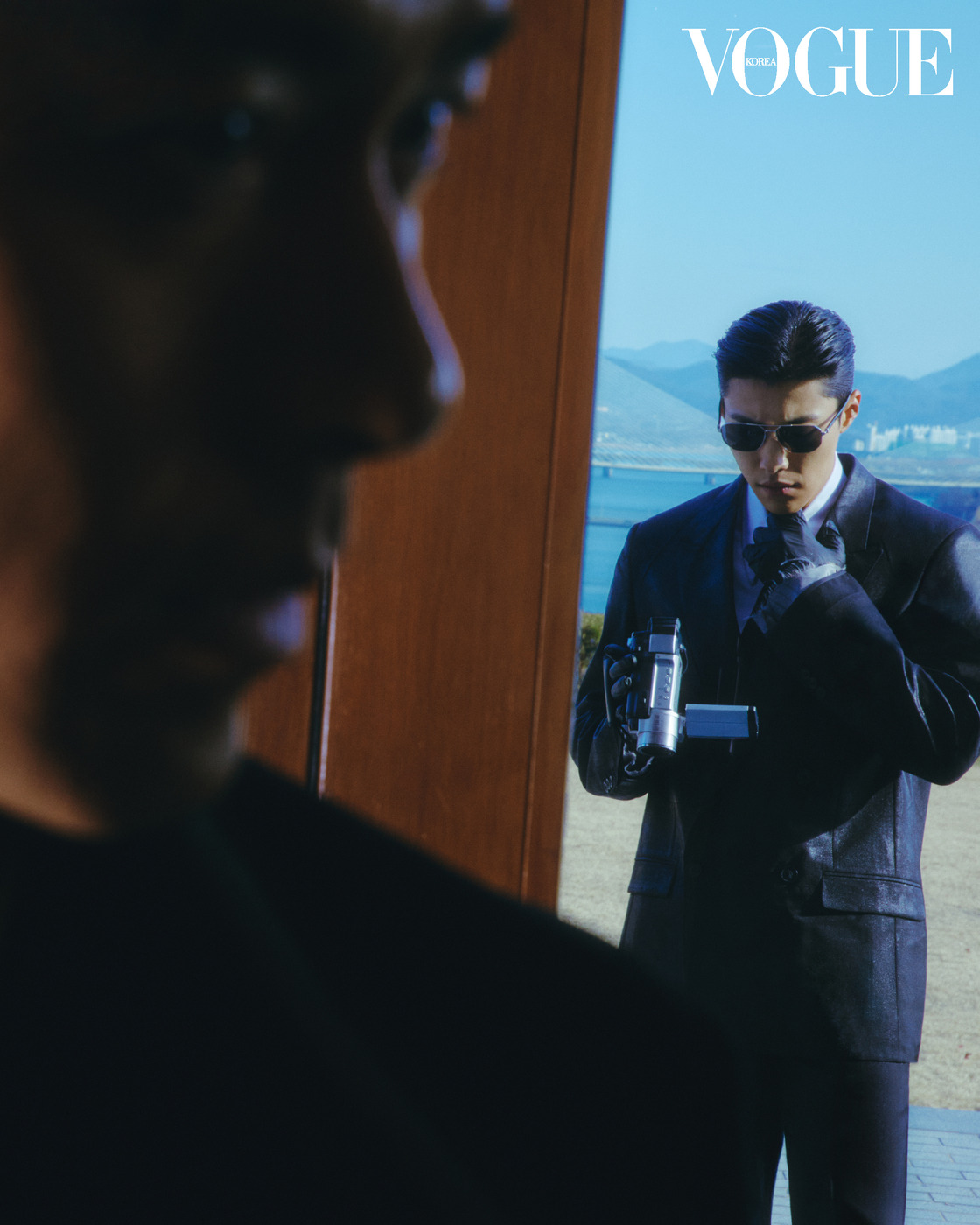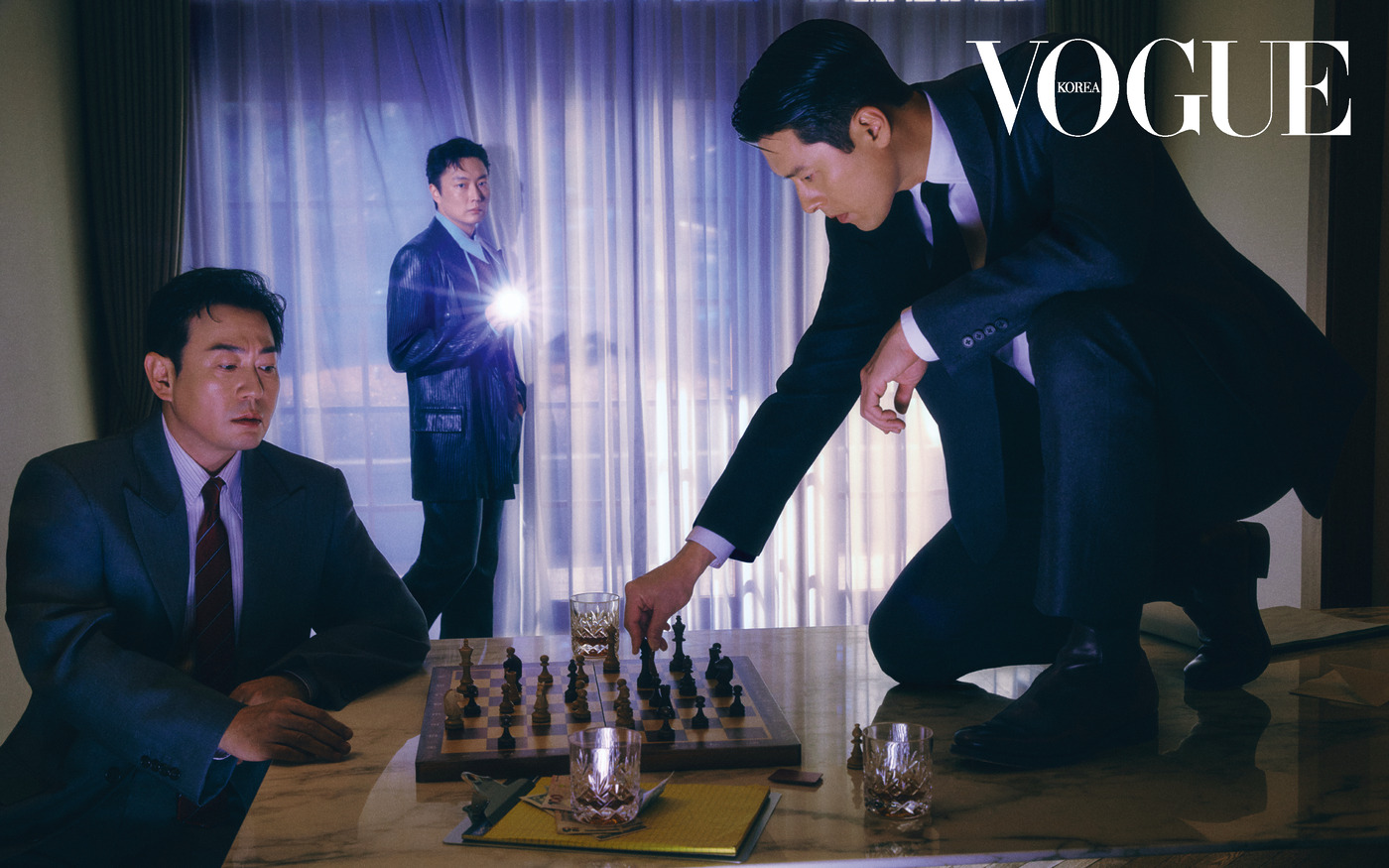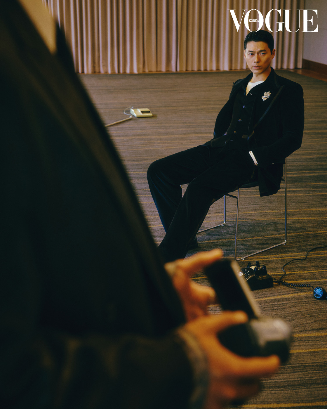 정석과도 같은 블랙 수트에 타이를 매고, 매끄럽게 가르마를 탄 현빈이 내 앞에 앉았다. 어쩐지 오랜만인 듯한 기분이었다. 그를 이렇게 가깝게 마주한 것은. <사랑의 불시착> 이후 그가 드라마로 돌아온 것은 6년 만이다. 디즈니+가 연말연시를 겨냥해 공개하는 새 시리즈 <메이드 인 코리아>에서 현빈은 1970년대 격동의 대한민국에서 주어진 위치에 만족하지 않고 은밀한 야망을 조금씩 드러내는 중앙정보부 부산지부 정보과장 백기태로 등장한다. <보그> 화보 촬영을 함께한 정우성, 우도환, 서은수, 정성일, 노재원, 박용우 등 폭넓은 세대를 대표하는 연기파 군단이 그를 중심으로 얽히고설키기에 어깨가 한층 무겁다. 작품 잘 봤다는 이야기로(인터뷰 준비를 위해 작품이 공개되기 전 시리즈 몇 화를 미리 본 상태였다) 말문을 연 내게 아직 편집본을 보지 못한 현빈이 되물었다. “아, 그래요? 정말 궁금해요. 어떻게 잘 나왔나요?”