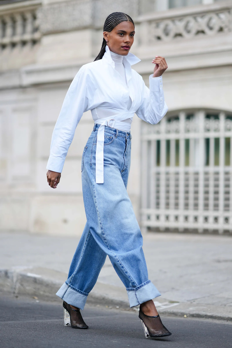 셀럽들의 스타일링도 눈여겨볼 만합니다. 티나 쿠나키는 헐렁한 청바지의 볼륨을 강조하기 위해 상의를 타이트하게 입어 허리선을 드러냈어요. 이렇게 입으면 자연스럽게 실루엣의 균형이 잡히고, 다리도 더 길어 보이죠. 줄리안 무어가 의외의 팁을 전합니다. 배럴 진을 입을 때 꼭 허리선을 드러낼 필요가 없다는 듯이 엉덩이를 덮는 길이의 청 재킷을 매치했죠. 오히려 단정하고 차분해 보이는군요. 덕분에 배럴 진이 캐주얼을 넘어 포멀한 영역까지 확장됨을 보여줍니다.