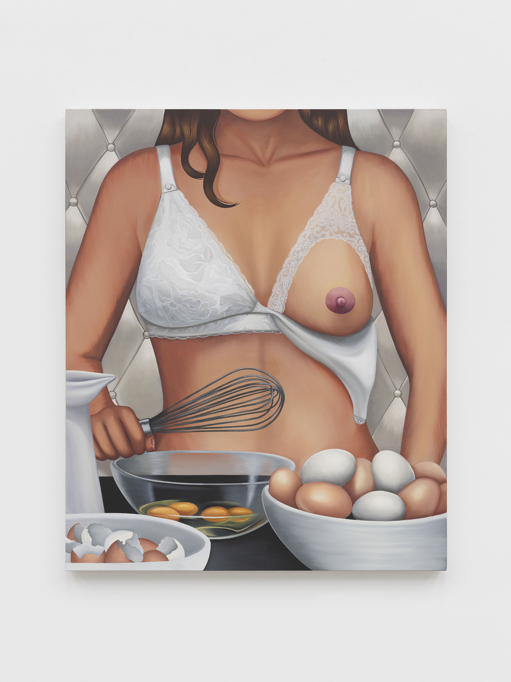 커티스 작품이 지닌 특유의 기묘함은 펠리컨뿐만 아니라 평범한 사물 혹은 일상적 순간으로도 드러납니다. 작가는 특히 아이를 키울 때 가장 친근하게, 자주 사용하는 ‘젖병’ 혹은 ‘공갈 젖꼭지’를 비대하게 그려놓거나, 아침 식탁 위 달걀 요리의 이미지를 클로즈업합니다. 고작 젖병 내지는 달걀일 뿐인데, 이 대상들이 얼마나 엄마 됨의 과정을 강렬하게 지배하는지 또렷하게 느껴집니다. 저 역시 쌓여 있는 육아용품과 육아 관련 노동에 잠식될 것 같다는 일종의 공포감을 느낀 적이 한두 번이 아니니까요. 특히 젖병의 젖꼭지 부분을 크게 그리고 옻칠해서 한결 매혹적으로 만든 작업 ‘대체품(Substitute)’은 이러한 작가의 고백에 초현실주의적인 뉘앙스를 더합니다. 엄마가 된 예술가가 자아 성찰을 하는 순간이 이토록 환상적일 수 있구나 싶더군요.