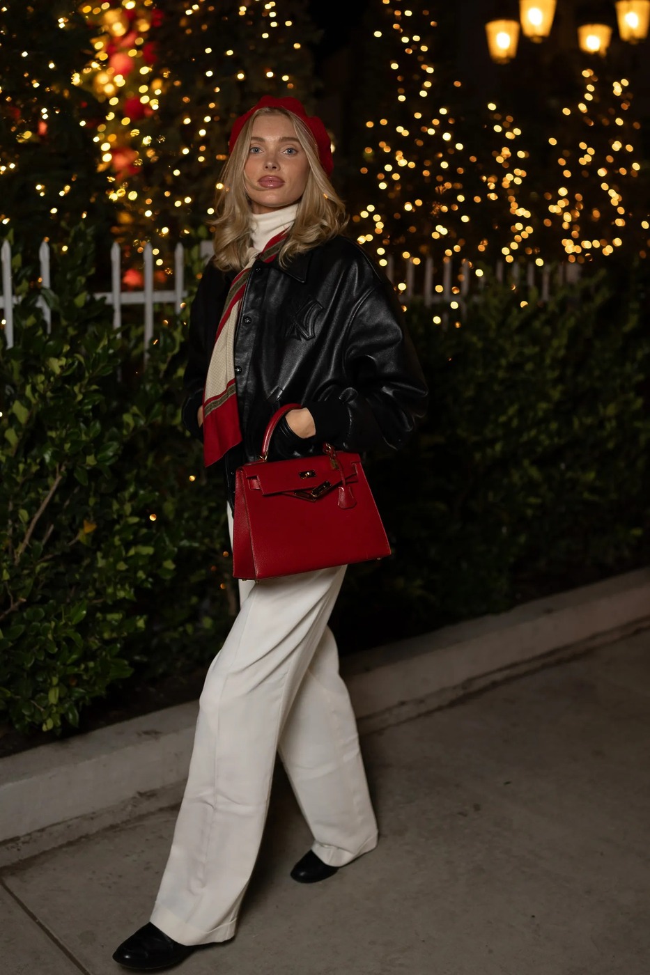 얼마 전, 엘사 호스크는 빨간 베레를 착용하고 랄프 로렌의 크리스마스 행사에 참석했습니다. 여기에 가죽 재킷과 흰색 터틀넥 톱, 같은 톤의 팬츠를 매치했죠. 흰색과 붉은색이 섞인 스카프와 빨간 버킨 백이 룩의 포인트가 되었습니다.