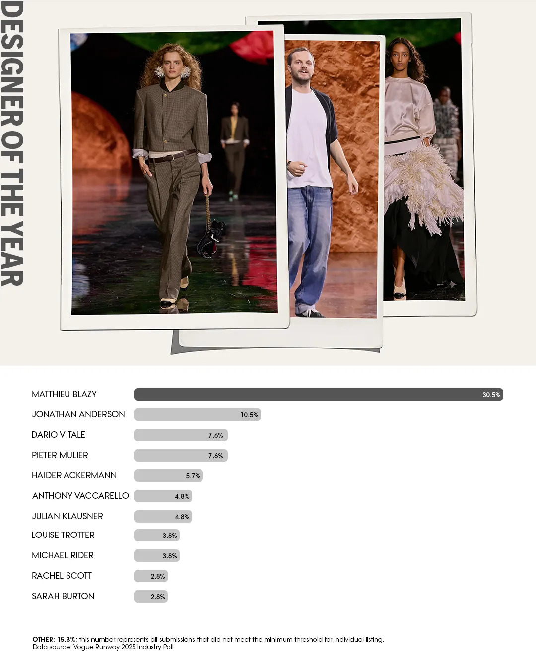 ‘올해의 디자이너’는 마티유 블라지입니다. 어느 정도 예상되었던 결과죠. 투표에 참여한 모 크리에이티브 디렉터는 블라지가 엄청난 부담감 속에서도 훌륭한 컬렉션을 선보였다고 설명했습니다. 또 다른 투표 대상자는 ‘인트레치아토에서 부클레로의 전향을 완벽하게 수행해냈다’라는 평을 남기는 동시에, ‘빈티지 샤르베 셔츠의 가격이 2배로 뛰었다’며 애교 섞인 불만을 드러내기도 했습니다. 2023년과 2024년 ‘올해의 디자이너’로 2년 연속 선정된 조나단 앤더슨은 블라지 다음으로 많은 10.5%의 표를 얻었습니다.