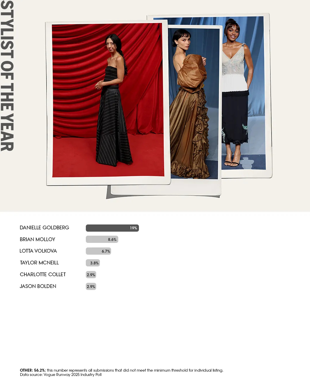 2023년과 2024년, ‘올해의 스타일리스트’ 상은 로타 볼코바(Lotta Volkova)에게 돌아갔습니다. 미우치아 프라다와 함께 미우미우 부흥기를 이끈 인물이 바로 그녀였기 때문이죠. 올해는 레드 카펫 스타일링으로 화제를 불러 모은 다니엘 골드버그(Danielle Goldberg)가 그 자리를 꿰찼습니다. 그녀는 그레타 리, 아요 에데비리, 조 크라비츠 등 수많은 셀럽의 스타일링을 담당하는 인물이죠. 골드버그는 ‘올해의 디자이너’ 1위와 2위에 빛나는 마티유 블라지, 조나단 앤더슨과도 오랜 기간 관계를 유지해오고 있습니다. 보테가 베네타와 로에베를 즐겨 입던 그레타 리와 아요 에데비리는 이제 디올과 샤넬의 앰배서더로 거듭났죠.