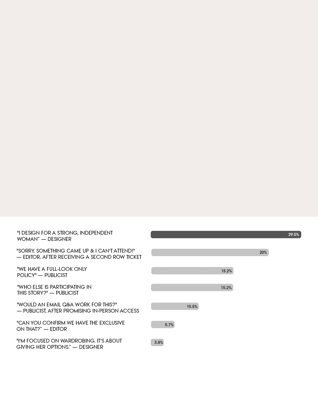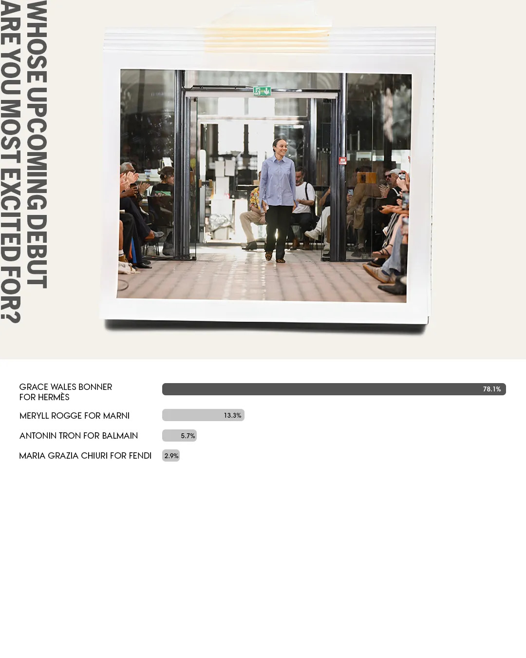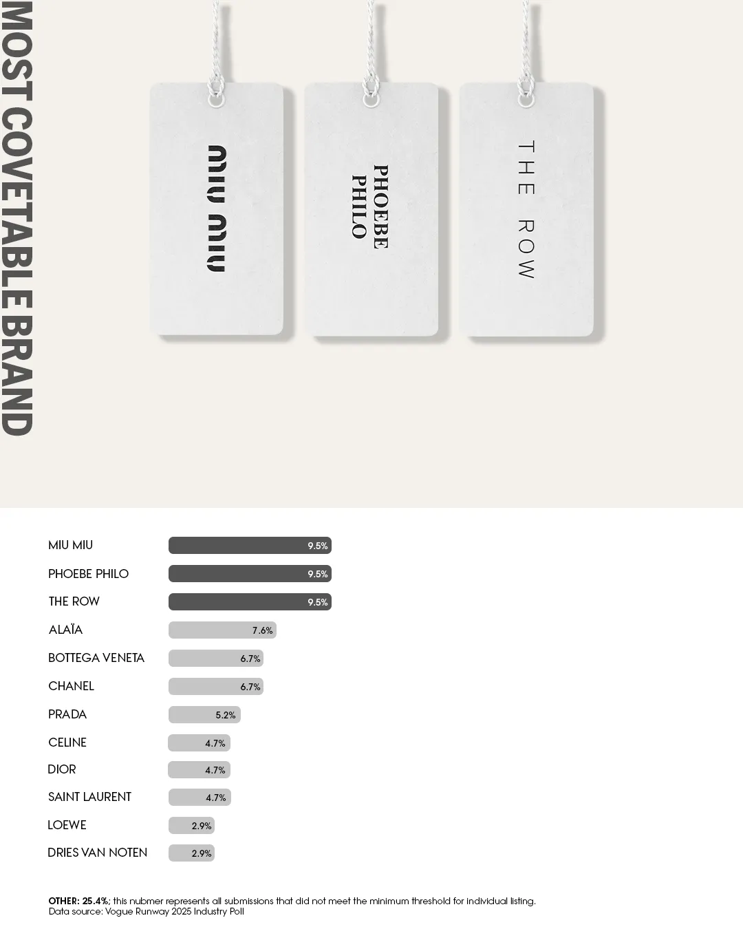 하루 종일 옷을 보고, 패션에 대해 생각하는 업계 관계자들조차 애태울 만큼 매력적인 브랜드는? 반전은 없었습니다. 미우미우, 피비 파일로, 그리고 더 로우가 나란히 9.5%의 득표율을 기록하며 공동 1위를 차지했습니다.