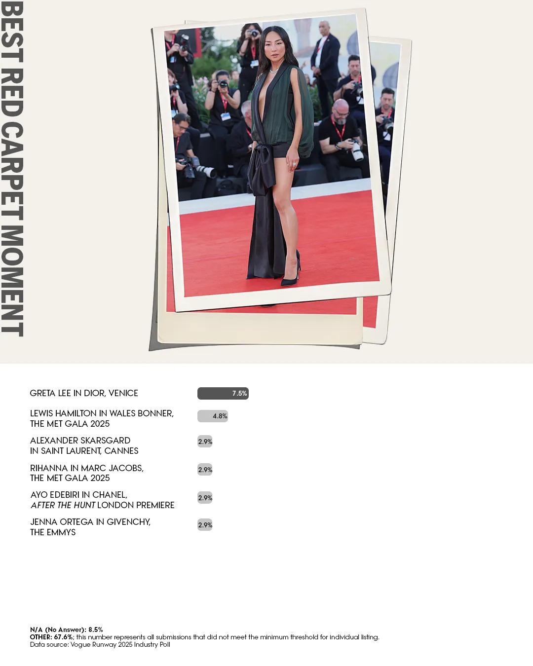 2025년 신설된 부문, ‘최고의 패션 클리셰’입니다. 지겨우면서도 들을 때마다 왠지 낄낄거리며 웃게 되는 클리셰 말이죠. 디자이너부터 에디터와 스타일리스트까지, 패션 업계에 몸담고 있다면 누구나 들어봤고 말해봤을 문장이 순위권에 위치했습니다(저 역시 올해에만 몇 번이나 “<보그> 독점 맞는 거죠?”를 입 밖으로 내뱉었는지 모르겠습니다). 대망의 1위를 차지한 클리셰는? 디자이너 인터뷰에 빠지지 않는 멘트, “저는 독립적이고 강인한 여성을 위해 디자인합니다.” 한마디만 보태겠습니다. 뻔한 말로 가득한 인터뷰를 보고 싶어 하는 사람은 아무도 없어요!