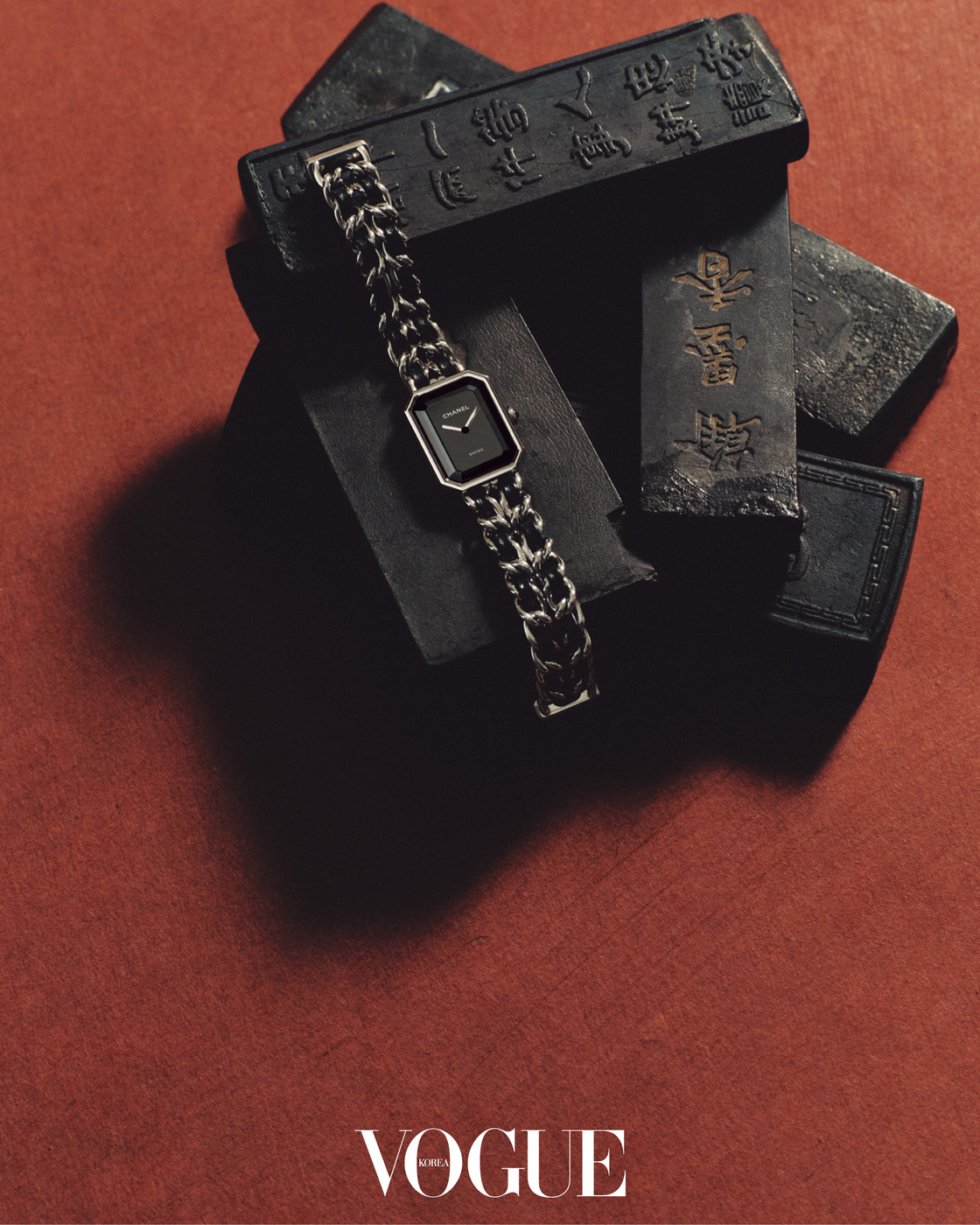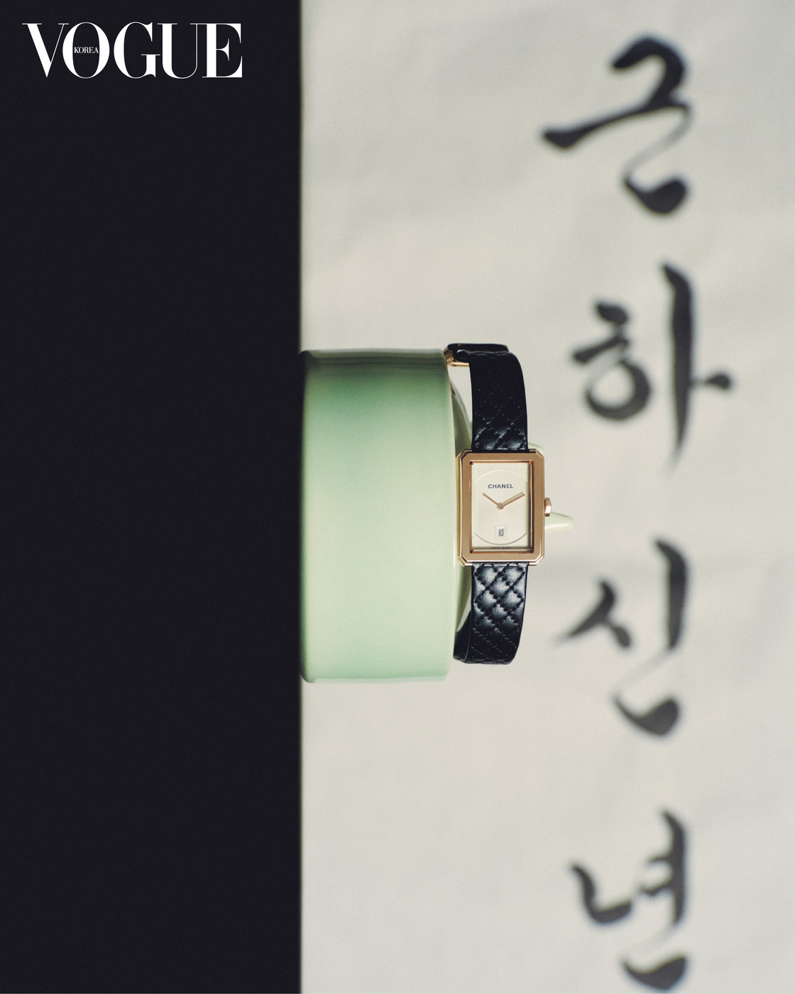 새해를 맞이하는 경건한 시간에 샤넬 시계가 함께한다. 18K 베이지 골드 케이스와 베젤, 크라운의 ‘보이프렌드’ 시계. 우아한 아름다움 속에 초정밀 쿼츠 무브먼트를 담고 있다. 서예는 하경애.