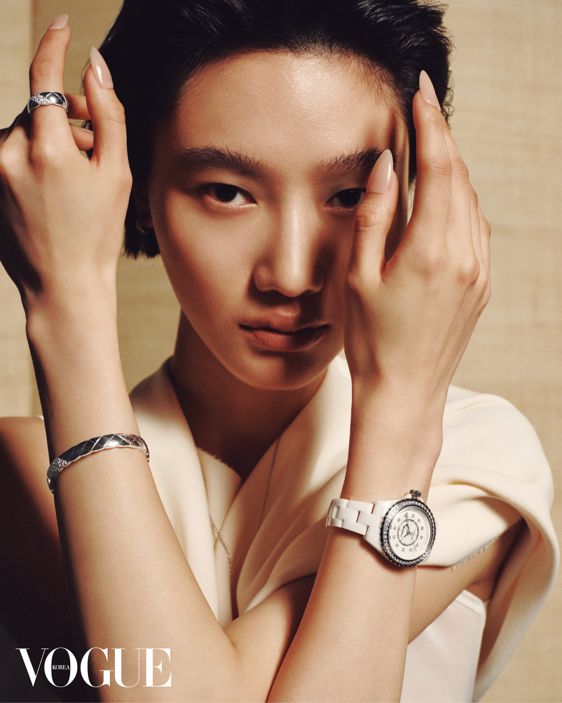 견고한 화이트 세라믹과 스틸 케이스의 ‘J12 다이아몬드 베젤 워치 칼리버 12.2’. 브릴리언트 컷 다이아몬드 46개를 세팅한 베젤과 다이아몬드 인디케이터 12개가 두드러진다. 18K 화이트 골드와 다이아몬드의 ‘코코 크러쉬’ 팔찌와 반지.