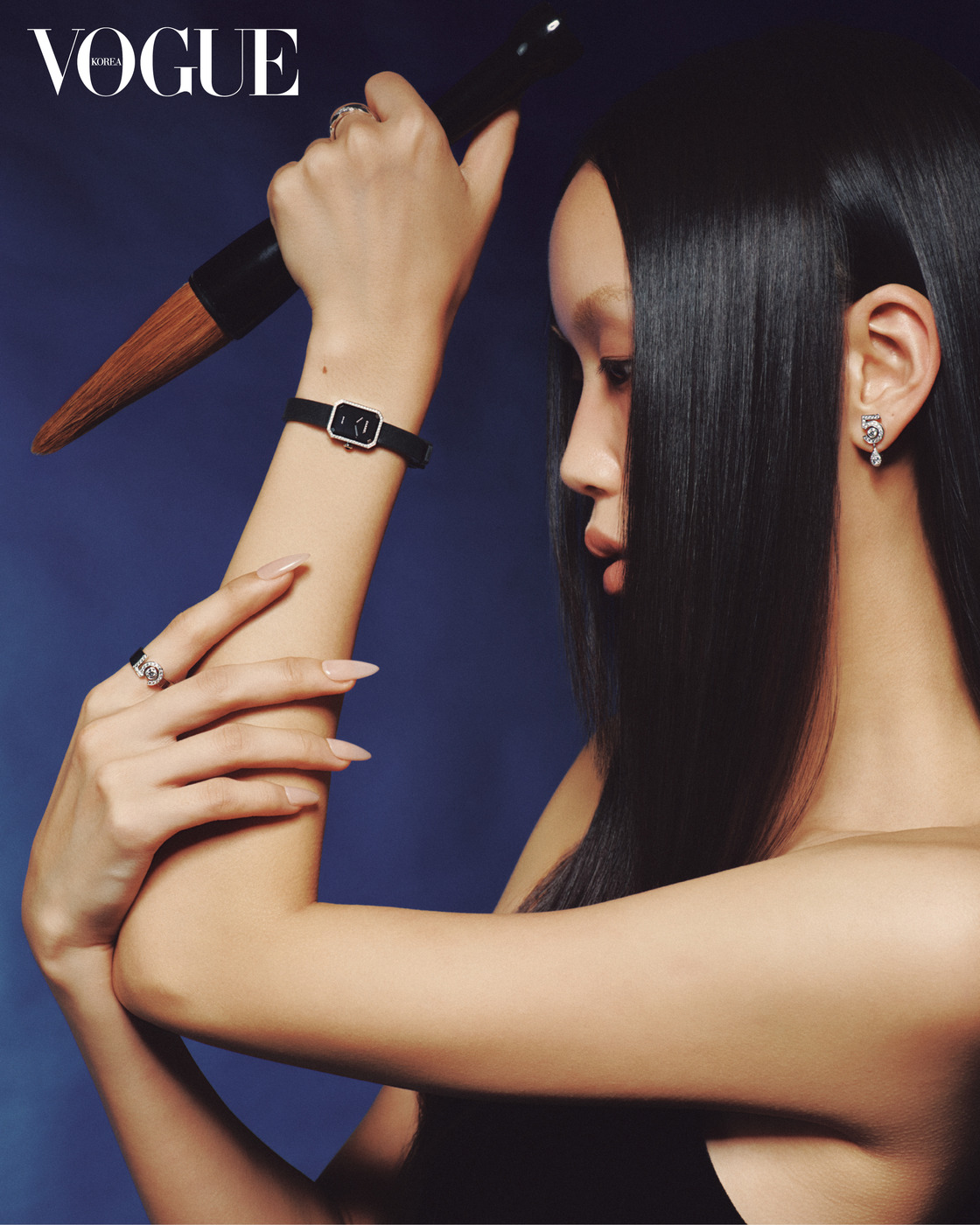 브릴리언트 컷 다이아몬드 52개를 장식한 스틸 케이스와 벨벳을 더한 검정 러버 스트랩으로 완성한 ‘프리미에르 리본’ 시계. 18K 화이트 골드, 다이아몬드의 ‘이터널 N°5’ 반지와 귀고리. 시계와 주얼리는 샤넬 워치 앤 파인 주얼리(Chanel Watches & Fine Jewelry).