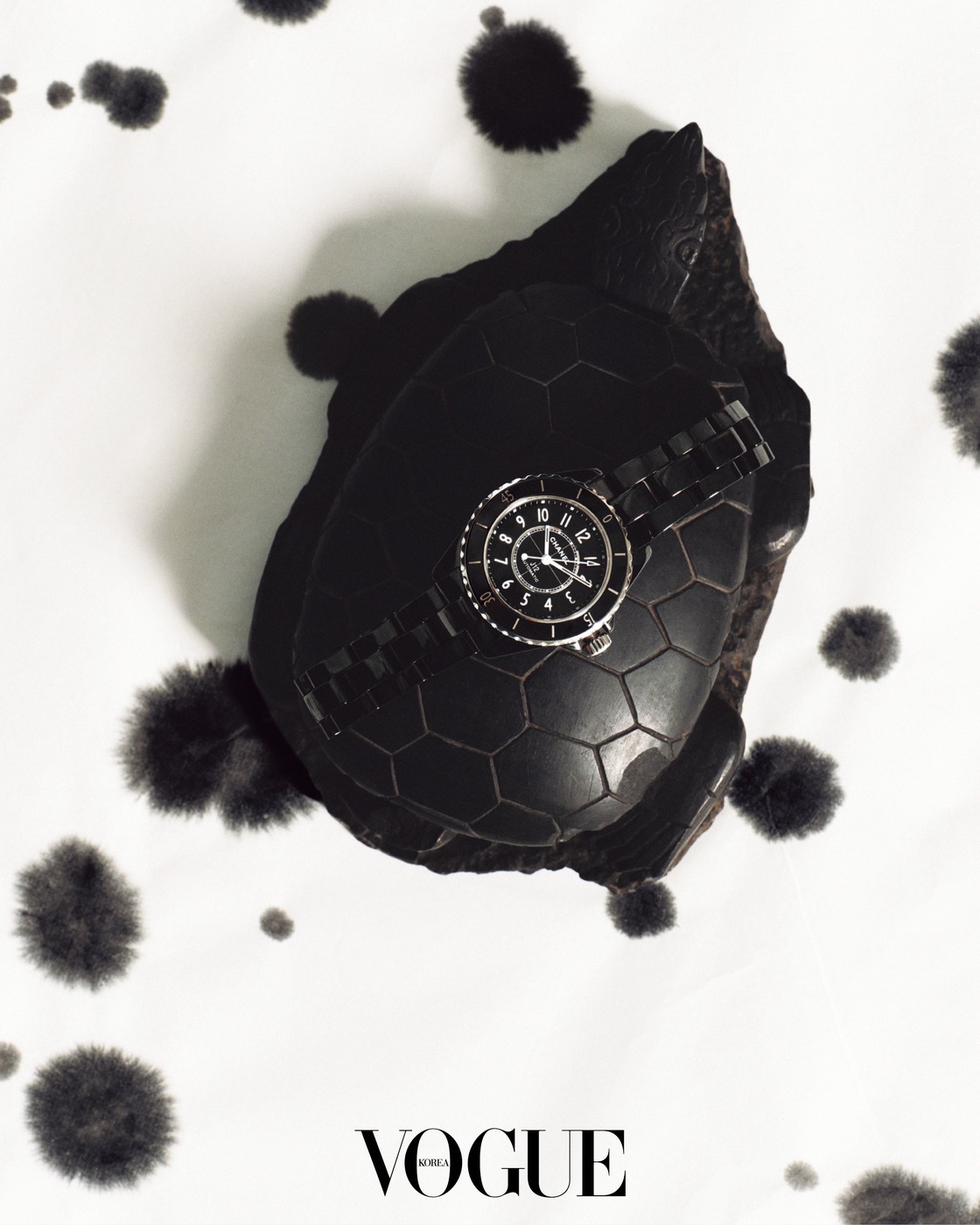 셀프와인딩 기계식 무브먼트 칼리버 12.2를 담은 ‘J12 워치 칼리버 12.2’. 투명한 다이얼 뒷면과 블랙 세라믹이 이루는 외관이 아름답다.