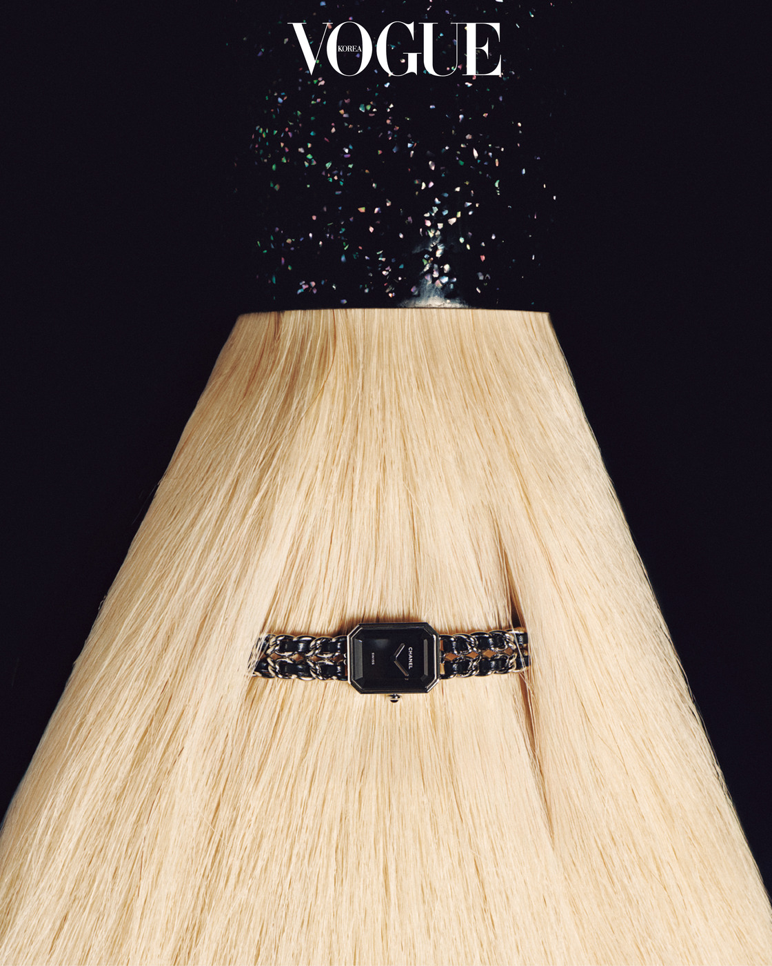 블랙 가죽 스트랩을 엮은 스틸 체인 브레이슬릿의 ‘프리미에르 아이코닉 체인 더블 로우’ 시계. 검정 래커 다이얼이 현대적이다. 18K 화이트 골드와 다이아몬드의 ‘이터널 N°5’ 팔찌와 반지, 귀고리.