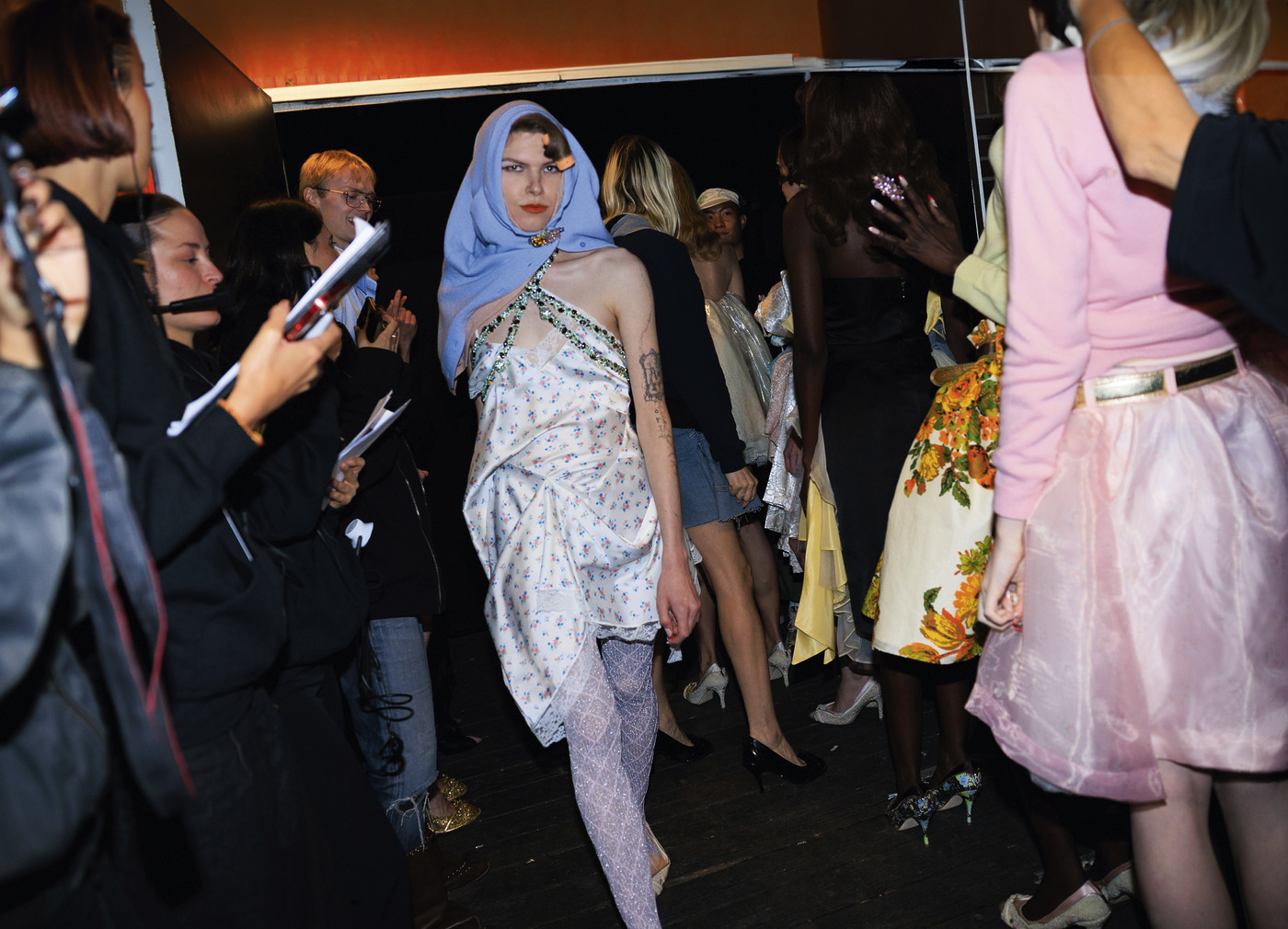 새로운 체제의 최전선에 서 있을지도 모르지만, 어거스트 배런의 ‘비주류적 투지’는 굳건히 제자리를 지키고 있다. 그 투지가 가장 뚜렷이 드러난 곳은 바로 거대한 홀에서 열린 패션쇼 애프터 파티였다. 낡은 모피 코트를 걸친 패션학도, 타이트한 티셔츠를 입은 소년들, 모두가 함께 작업하길 원하는 유명 사진가와 크리에이티브 디렉터 군단이 어거스트 배런을 위해 한곳에 모였다. 모두 루시 맥과이어처럼 ‘짜릿한 경험’을 한 직후였다. 베를린 출신 사진가 겸 디제이 렝구아(Lengua)가 무대 위에서 거친 테크노 비트를 쏟아낼 때 모두와 함께 몸을 흔들며 나는 스스로 다짐했다. 지하철 파업이건 교통 체증이건 다음 어거스트 배런 패션쇼에는 무슨 수를 써서라도 참석할 거다! VK