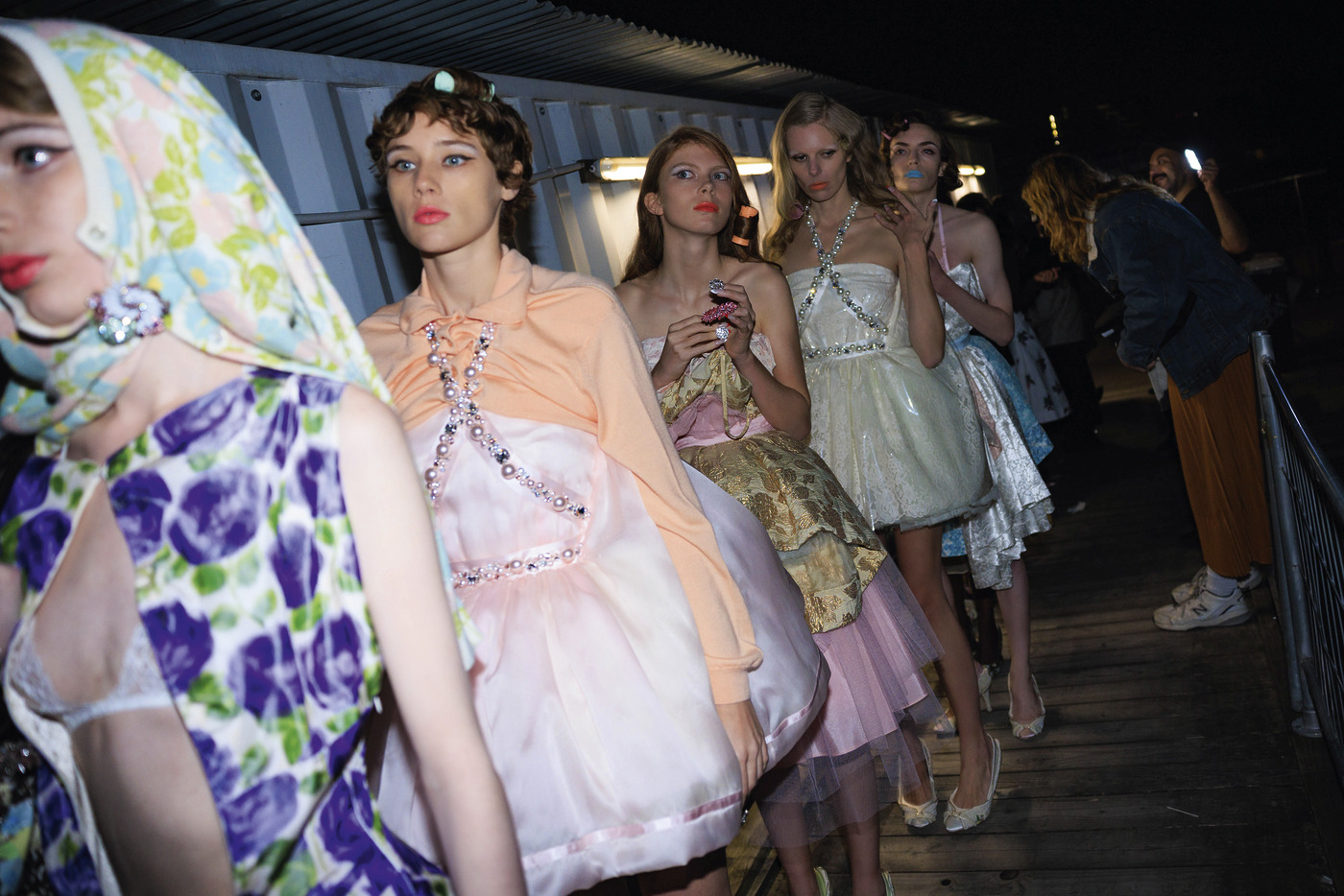 쇼룸에서 어거스트 배런의 옷을 마주한 순간, 왜 그들이 지금 모두에게 주목받는지 알 수 있었다. 기분이 좋아지고 숙취가 풀리는 것은 물론 안색마저 밝아지는 기분이었다. 분홍빛 태피터 원단을 구기고 꼬아 만든 칵테일 드레스 위에는 레이스, 금속성 다마스크와 얇은 튤 조각을 덧댔다. 밤색 크롭트 폴로 니트는 옆 솔기를 지퍼로 교체해 어깨 뒤에서 엉덩이 앞부분까지 구불구불 옆 선을 따라 부착했다. 네크라인이 여러 개인 레이어드 플래드 셔츠, 작은 꽃무늬 오간자 퍼프볼 스커트는 해류에 떠다니는 해파리처럼 옷걸이에 걸려 있었다.