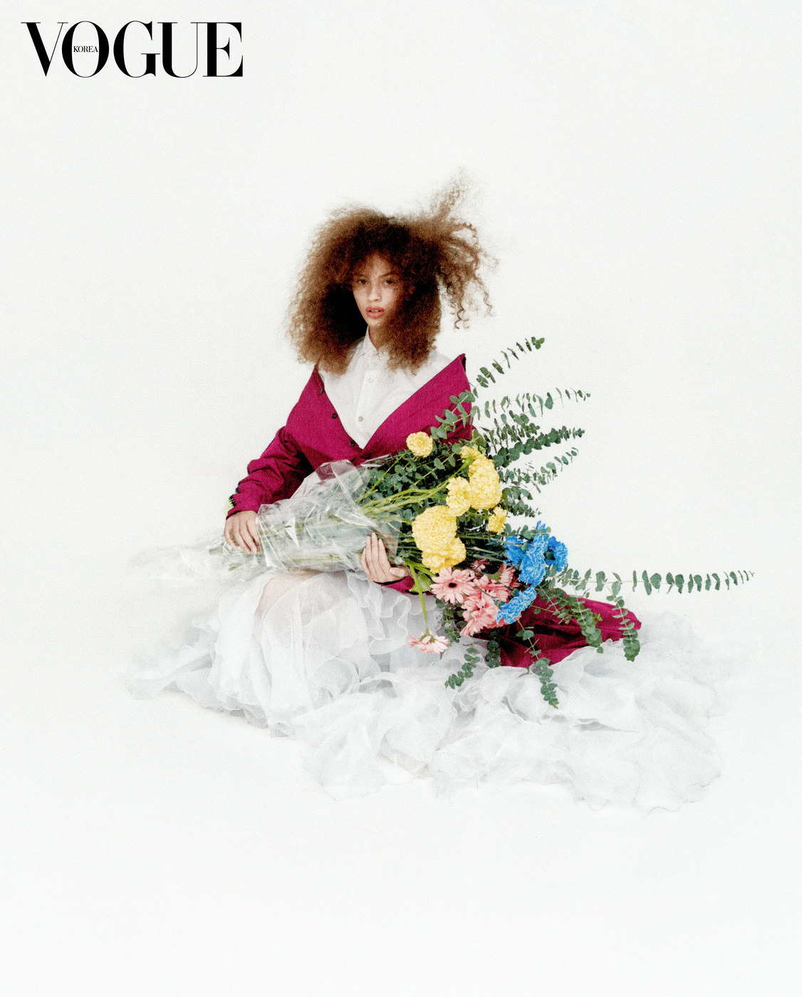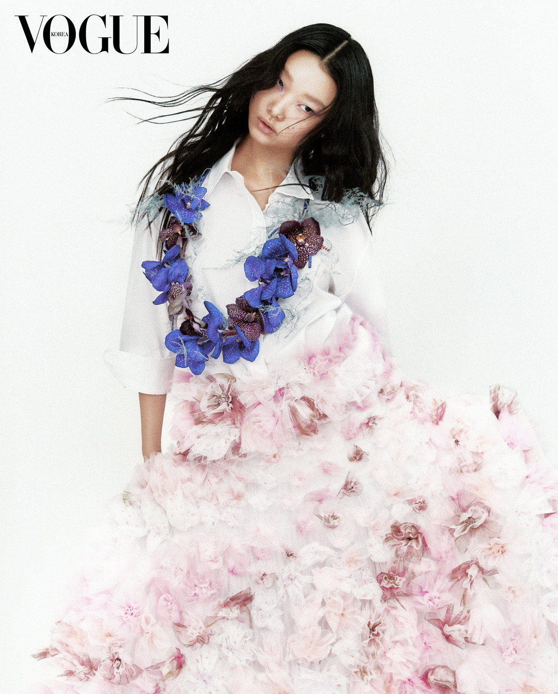 셔츠는 유니클로(Uniqlo), 층층이 프릴을 장식해 롱스커트로 연출한 튤 소재 드레스는 후아나 마르틴(Juana Martín Couture), 귀고리는 알라이아(Alaïa).
