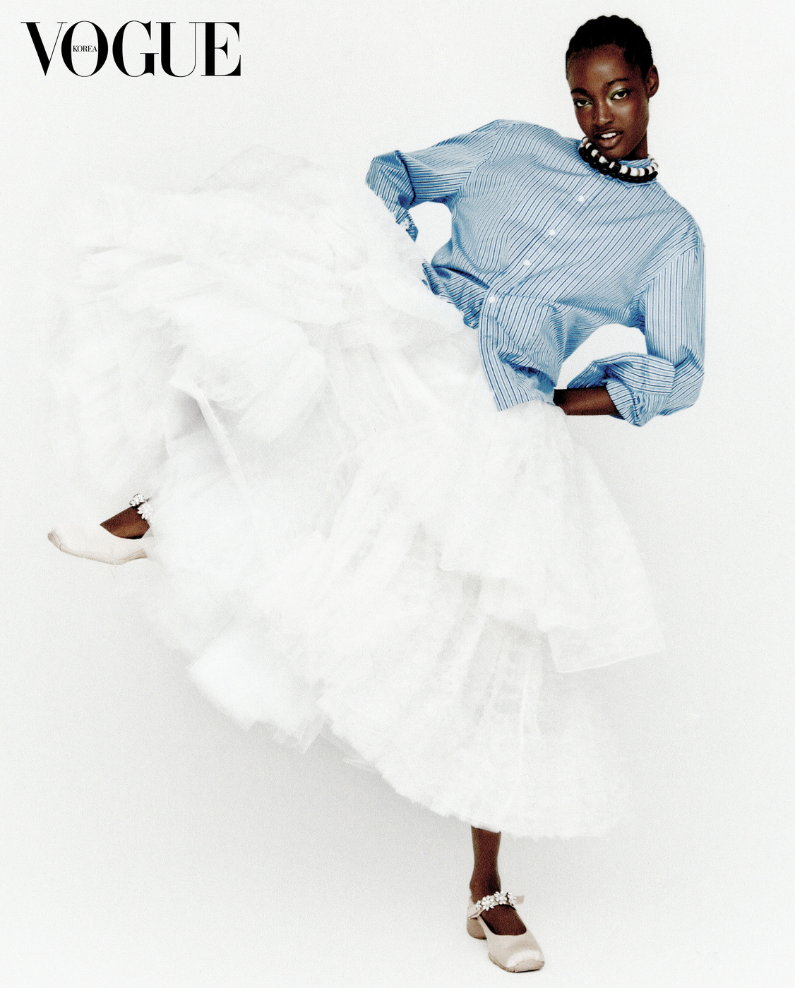 클래식한 핀턱 셔츠는 키톤(Kiton), 저지 소재 하늘색 스커트는 알라이아(Alaïa), 화이트 튤 스커트는 오토링거(Ottolinger).