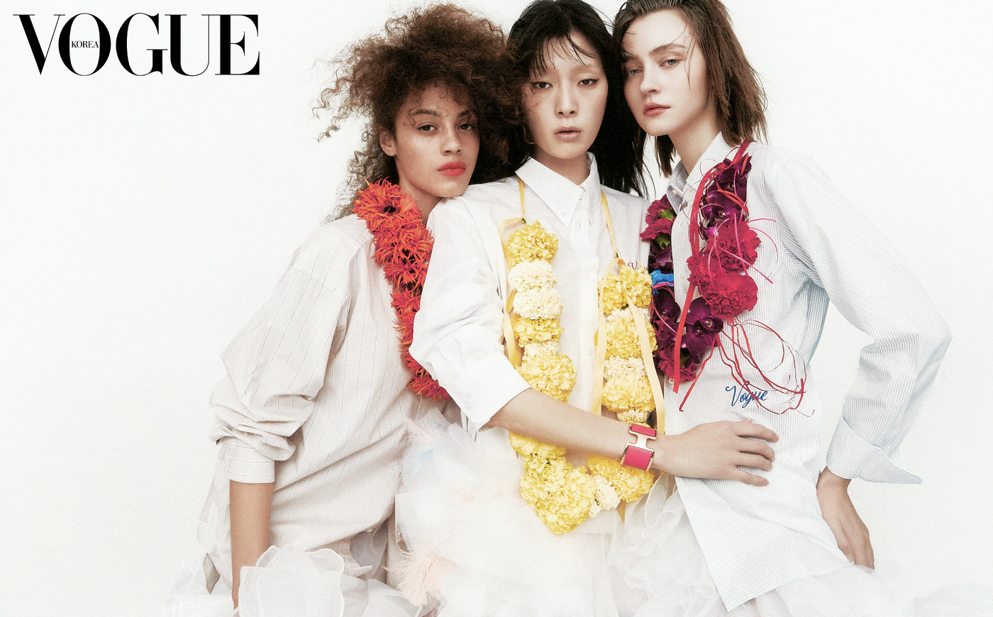 올봄 셔츠 스타일링 첫 번째 아이디어. 스커트 안에 넣지 말고 입을 것. 이번 화보 촬영을 위해 ‘보그’ 로고를 더한 셔츠는 유니클로(Uniqlo), 자라(Zara, 가운데 모델), 왼쪽 모델과 가운데 모델이 착용한 스커트는 수잔 팡(Susan Fang), 오른쪽 모델이 착용한 스커트는 오토링거(Ottolinger), 뱅글은 에르메스(Hermès).