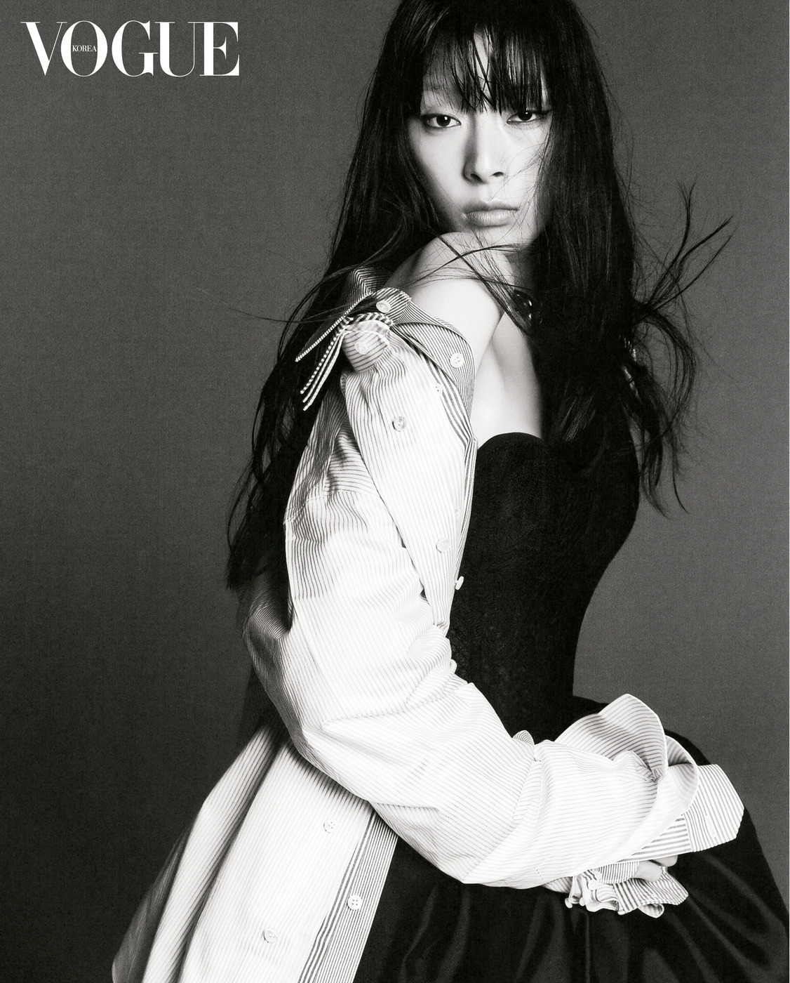 검정 조끼와 스커트는 어웨이크 모드(A.W.A.K.E. Mode), 셔츠는 보테가 베네타(Bottega Veneta), 스카프는 에르메스(Hermès), 플랫 슈즈는 사카이(Sacai), 오른손 중지와 왼손 검지에 착용한 반지는 쇼 주얼리(Scho Jewelry), 오른손 검지 반지는 루이 비통 파인 주얼리(Louis Vuitton Fine Jewelry), 왼손 중지 반지는 리플렉트(Reflect).