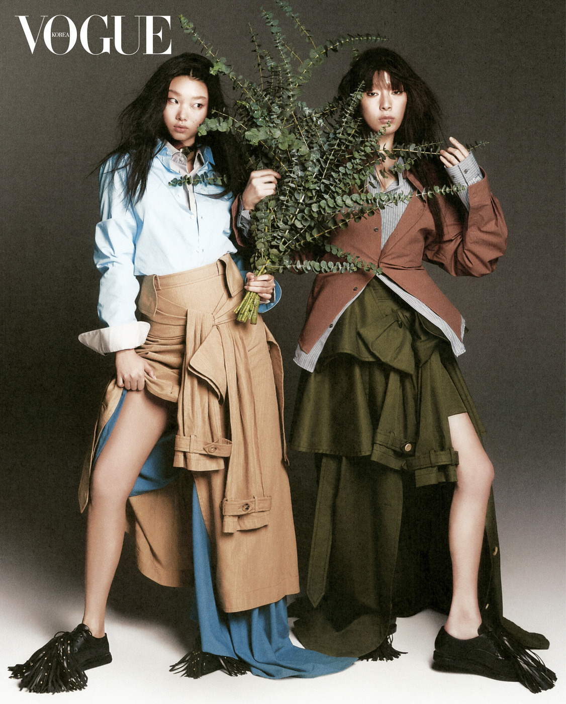 왼쪽 모델의 셔츠는 타임 옴므(Time Homme), 하늘색 셔츠는 구찌(Gucci), 푸른색 스커트는 푸시버튼(Pushbutton), 프린지 장식 플랫 슈즈는 사카이(Sacai), 초커 형태 목걸이는 1064 스튜디오(1064 Studio), 오른쪽 모델의 스트라이프 셔츠는 지제로 송지오(Zzero Songzio), 갈색 셔츠는 렉토(Recto), 비대칭 헴라인의 스커트는 빅터앤롤프(Viktor&Rolf).