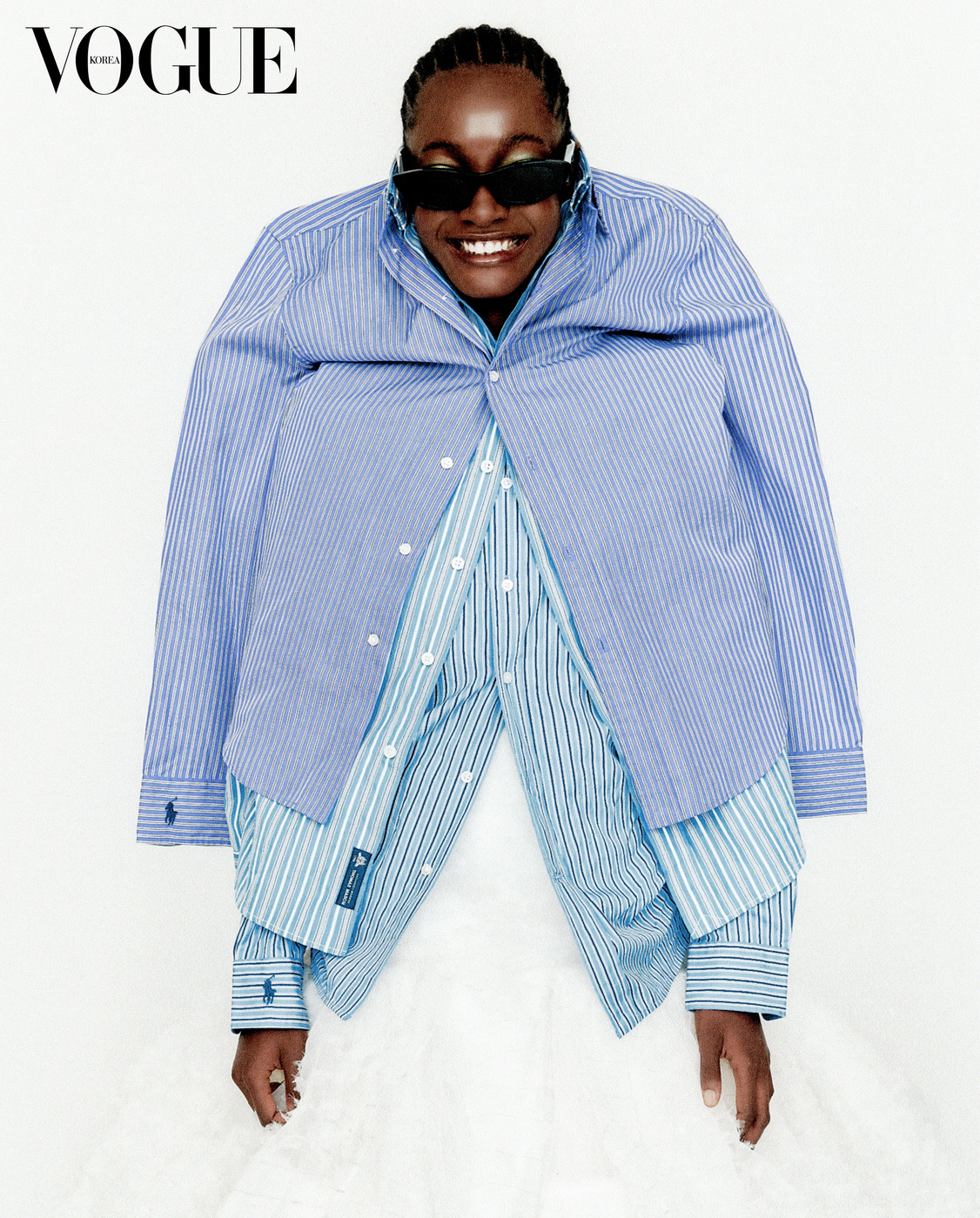 런웨이에서처럼 샤넬이나 보테가 베네타 같은 하이엔드 브랜드의 셔츠를 고집할 필요는 없다. 깔끔하고 실용적인 버튼다운 셔츠에 화려한 볼 스커트면 충분하다. 남성복 느낌의 셔츠는 스커트의 화려함을 균형감 있게 보완한다. 안에 착용한 스트라이프 셔츠는 스포티앤리치(Sporty&Rich), 이번 촬영을 위해 특별히 제작한 ‘보그’ 자수를 놓은 화이트 셔츠는 자라(Zara), 맥시 스커트는 몽클레르×EE72(Moncler×EE72 by Edward Enninful), 위에 레이어드한 페이턴트 소재의 풍성한 스커트는 모스키노(Moschino), 반짝이는 크리스털 자수 프린지가 달린 스웨이드 부츠는 마이클 마이클 코어스(Michael Michael Kors).
