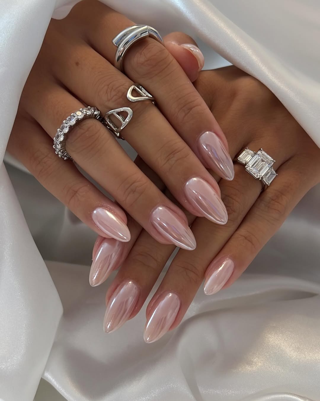 헤일리 비버처럼 아몬드 모양의 윤기 나는 글라스 네일을 시도해보세요. 로드 창립자는 29번째 생일을 축하하며 매우 시어한 글라스 네일을 선보였어요.
