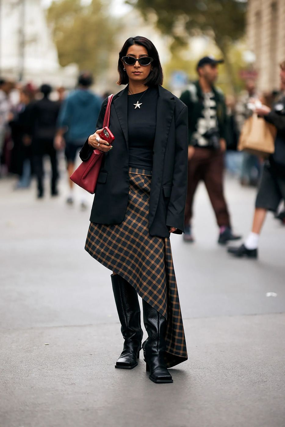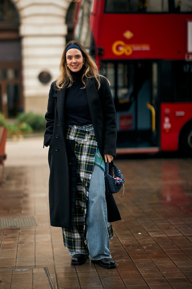 바지 위에 치마를 겹쳐 입는 방식이 몇 년째 유행 중입니다. 발목을 덮을 정도로 긴 체크 스커트는 이 스타일링을 연출할 때도 도움을 줍니다. 특유의 반항적인 무드 덕분에 와이드 팬츠와의 궁합이 특히 훌륭하죠. 청바지, 또는 캐주얼한 색상의 바지 위에 치마를 둘러주기만 하면 끝입니다.