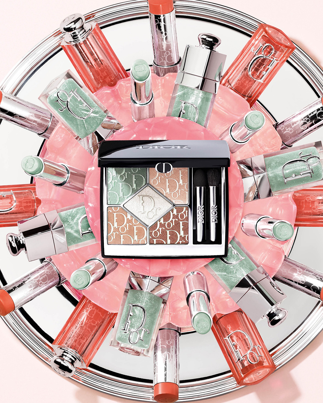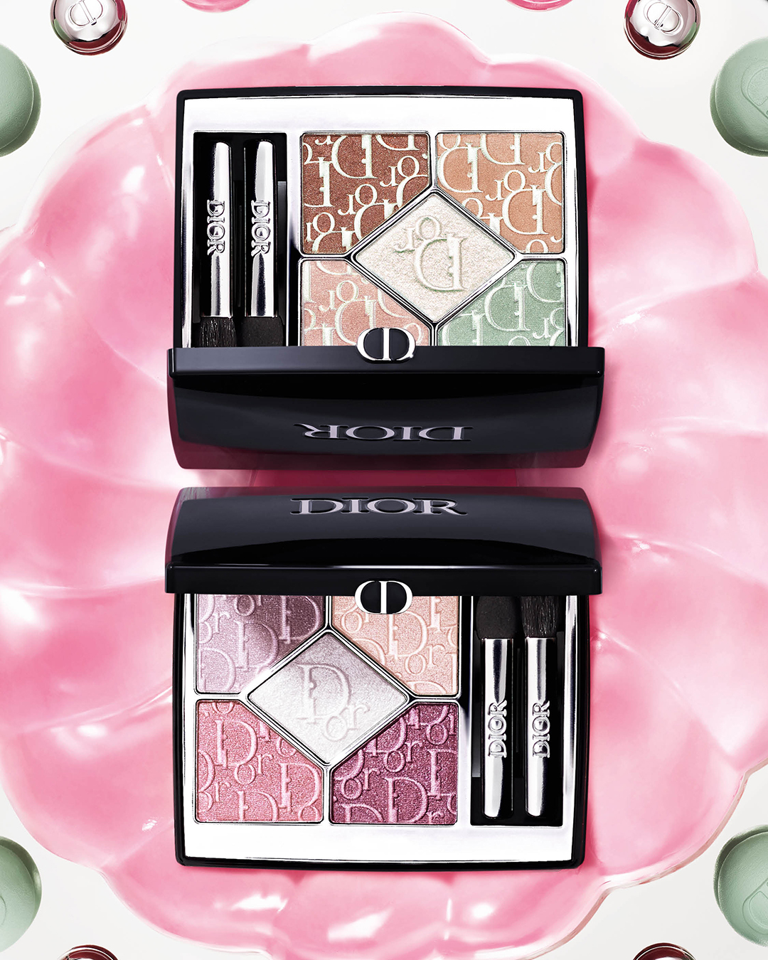 아이 메이크업에서는 두 가지 리미티드 에디션으로 선보이는 디올쇼 5 꿀뢰르가 중심에 선다. 핑크와 민트 컬러 조합 위에 디올 오블리크 로고매니아 패턴을 더하고, 진줏빛 홀로그래픽 피그먼트를 입힌 파우더는 빛의 각도에 따라 다채롭게 반응한다. 컬렉터 에디션다운 꾸뛰르 디테일이 돋보이는 지점이다.