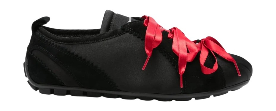 트렌드를 이끈 건 시몬 로샤입니다. 고전적 의미의 여성성에 독특한 고딕 정신을 결합해, 2020년대 새로운 페미닌 룩으로 Z세대의 환호를 이끌어낸 바 있죠. 2025 가을/겨울 런웨이에서는 끈 대신 리본을 사용한 둥근 토의 새틴 스니커즈를 선보였습니다.