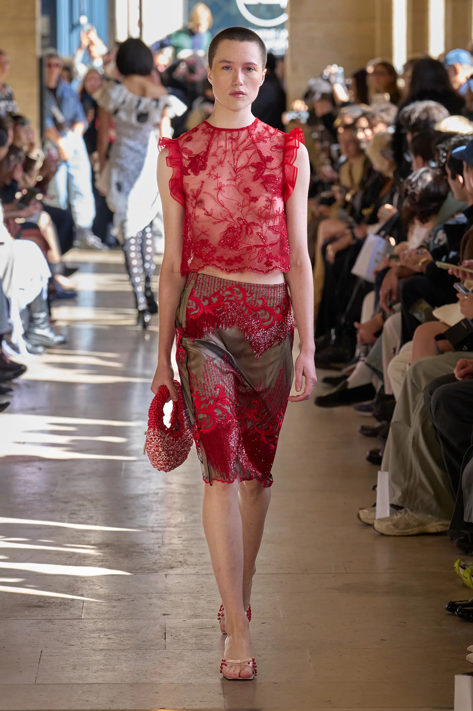 비법은 간단합니다. 블라우스를 만들 때 흔히 쓰는 코튼이나 새틴 대신, 레이스처럼 속이 비쳐 보이는 소재를 사용하는 거죠. 발렌티노의 두 룩이 완벽한 예입니다. 실루엣은 분명 우리가 알고 있던 블라우스와 다를 게 없지만, 소재를 바꾸니 완전히 색다른 분위기가 연출됐죠. 스타일링이 어려울 것도 없습니다. 격식을 원한다면 치마를, 보다 현실적인 데일리 룩을 완성하고 싶다면 늘씬한 시가렛 팬츠를 입으면 되죠. 슈팅 추는 화려한 장식을 가미한 펜슬 스커트를 활용해 ‘드레스업’ 시대에 걸맞은 스타일링을 선보였습니다.