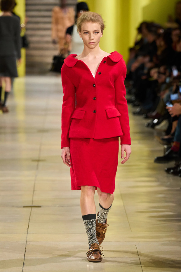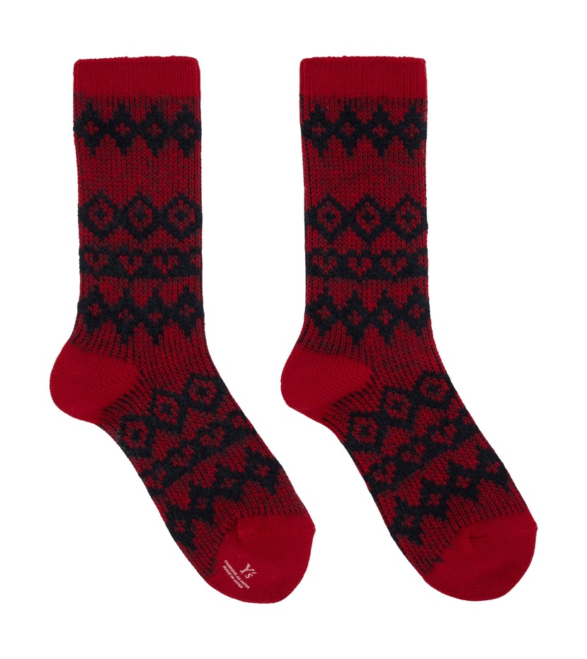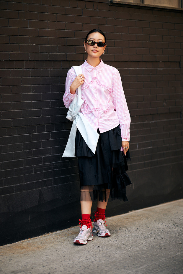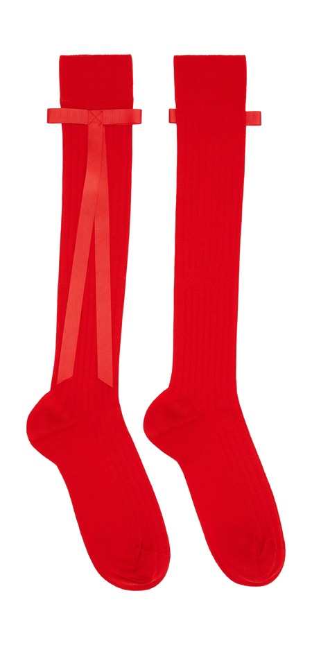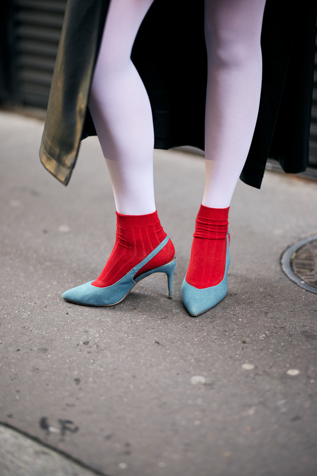 레드 컬러가 유행하기 때문인지, 새빨간 양말로 위트를 살린 룩도 눈에 띄었습니다. 레드와 궁합이 좋기로 소문난 블랙을 활용하는 것은 물론, 분홍 타이츠와 빨간 양말을 조합해 톤온톤 스타일링을 완성하는 것도 가능하죠.