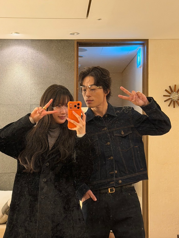 꼭 모든 아이템이 비슷할 필요는 없어요. 커플 룩을 연출할 때 가장 쉬운 방법 중 하나는 바로 액세서리를 맞추는 거죠. 롱 코트를 입은 문가영과 올 데님 룩을 입은 구교환. 실버 프레임 안경을 쓰는 것만으로도 분위기가 이어진 것처럼 보이는군요.