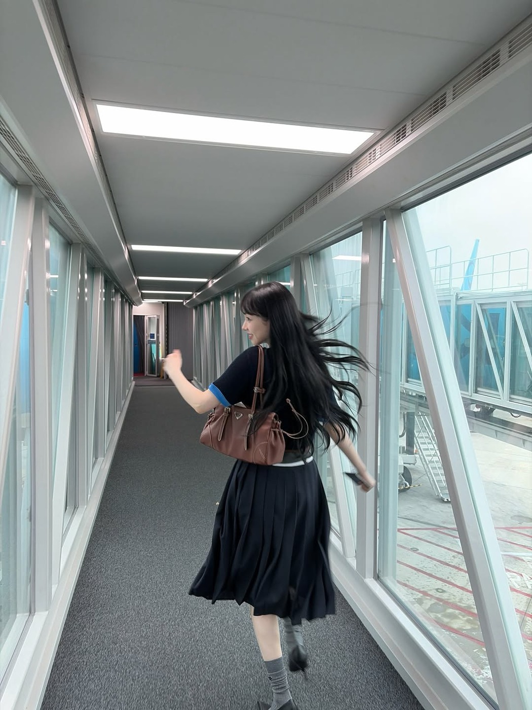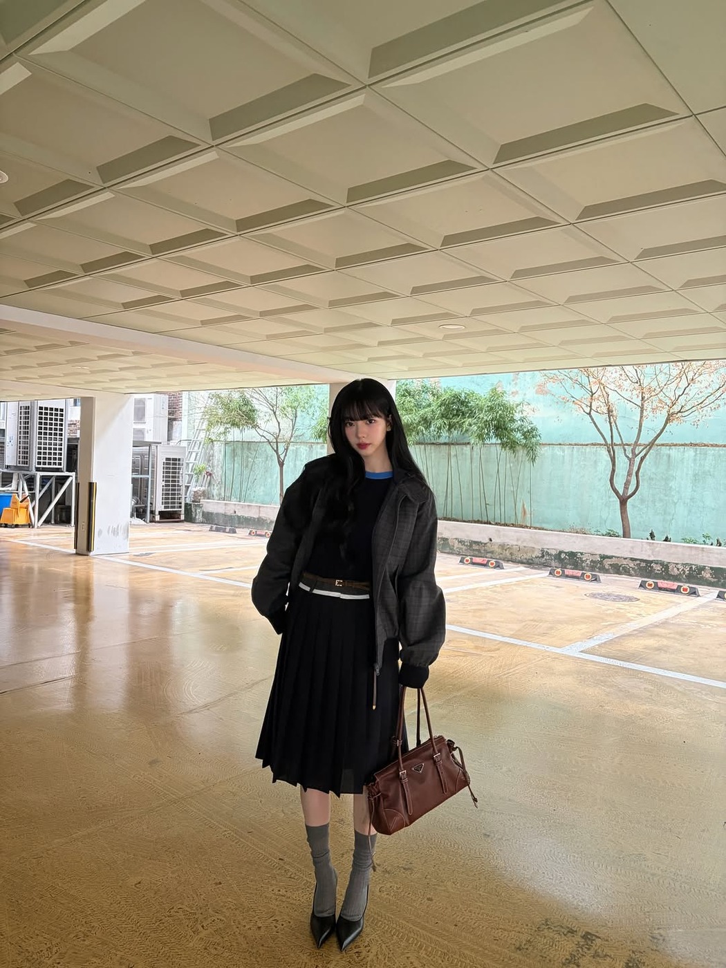 카리나는 프레피 룩을 연출했습니다. 봄버 재킷, 반소매 니트, 플리츠스커트, 그리고 양말을 매치했죠. 미디스커트의 밑단과 신발 사이 애매한 구간을 양말로 채워주니 다리가 뚝 끊겨 보이지 않고 시선이 자연스럽게 흐릅니다. 상의와 아우터를 겹겹이 쌓아 올린 만큼, 하체에도 레이어를 하나 더해 균형을 맞춘 셈이죠.
