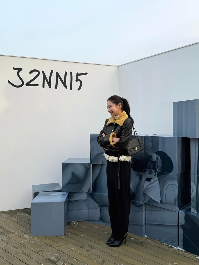 터틀넥과 무스탕 재킷으로 목 주변이 답답해질 수 있기 때문에 헤어는 하이 포니테일로 연출했습니다. 시선을 위로 끌어올려 전체 비율을 가볍게 만든 검 덤이고요. 크롭트 디자인의 무스탕 재킷도 눈여겨볼 만합니다. 제니는 허리가 잘록하게 강조되는 이너를 입고, 그 라인을 드러내는 재킷을 입어 자연스러운 균형을 만들었죠. 만약 재킷이 조금만 더 길었다면 위는 커지고 아래는 갑자기 좁아 보이는 어색한 대비가 생겼을 거예요. 누가 무스탕을 이렇게 잘 입나요!