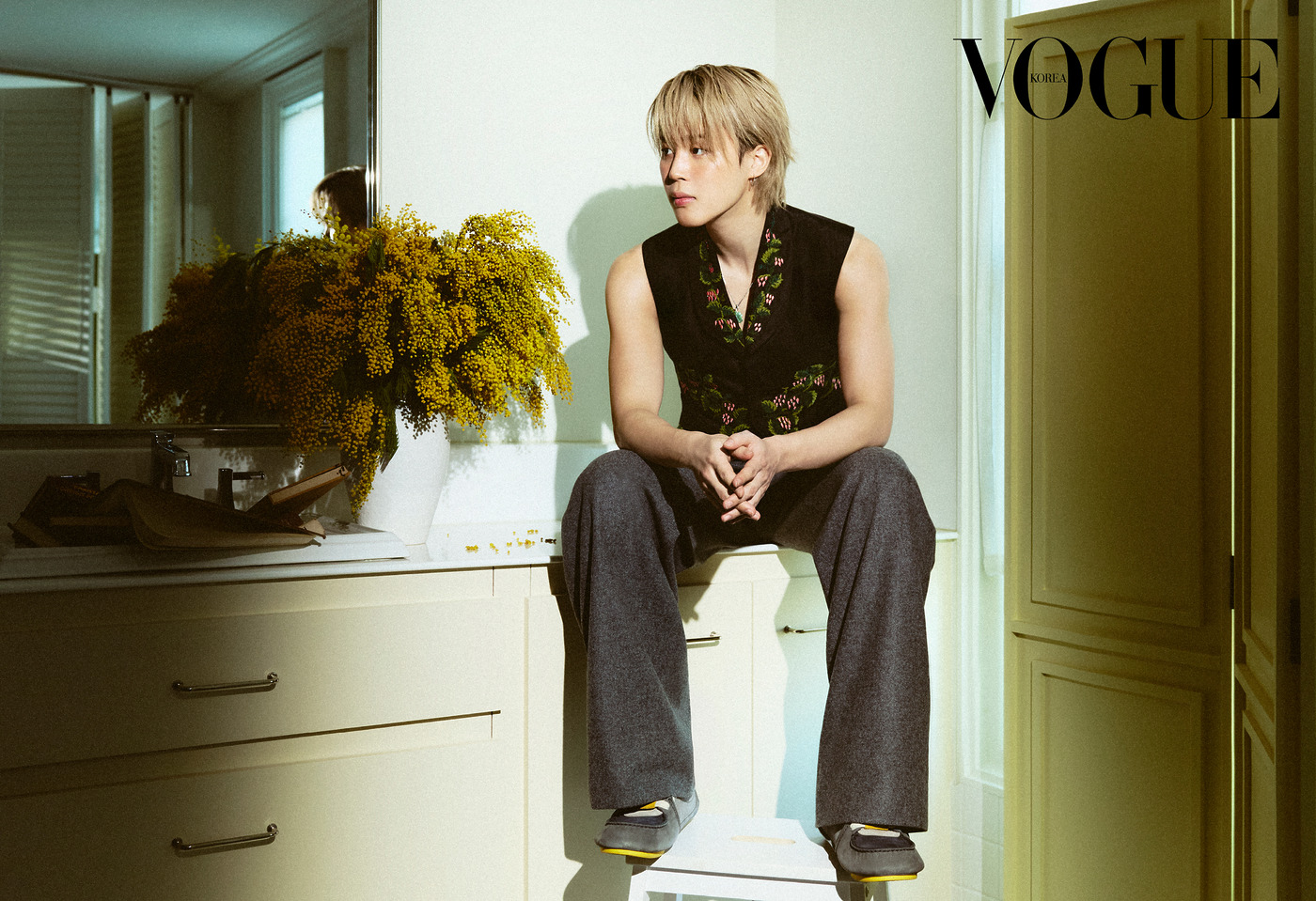 잔꽃무늬의 활동적인 베스트와 팬츠. 지민의 개성과 스타일이 따스한 봄기운, 미모사의 향기와 함께 만개했다.