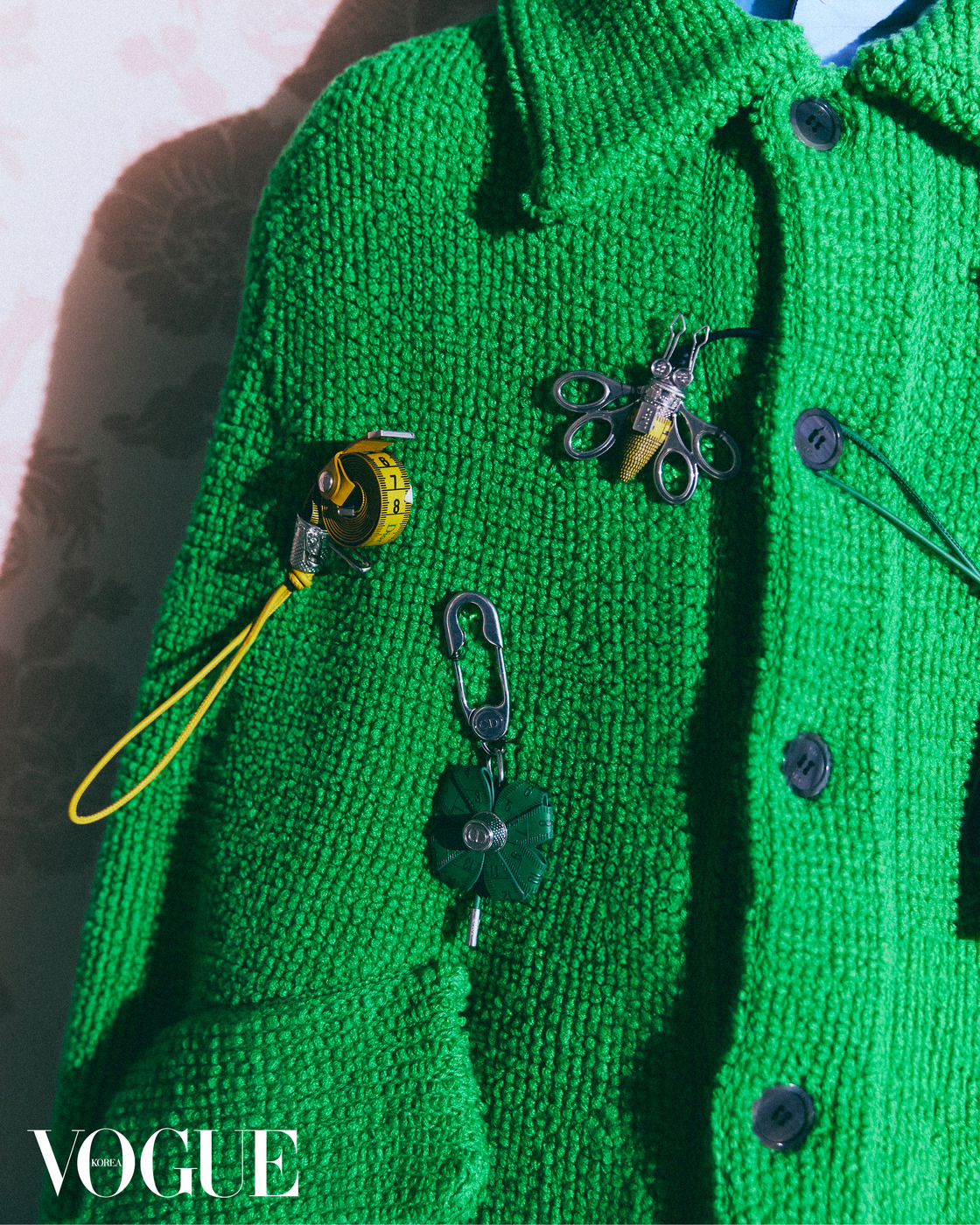 캐시미어 루프 니트 소재 초록색 케이프에 다양한 참 장식 브로치를 스타일링하고 블루 하이넥 셔츠를 함께 매치했다.