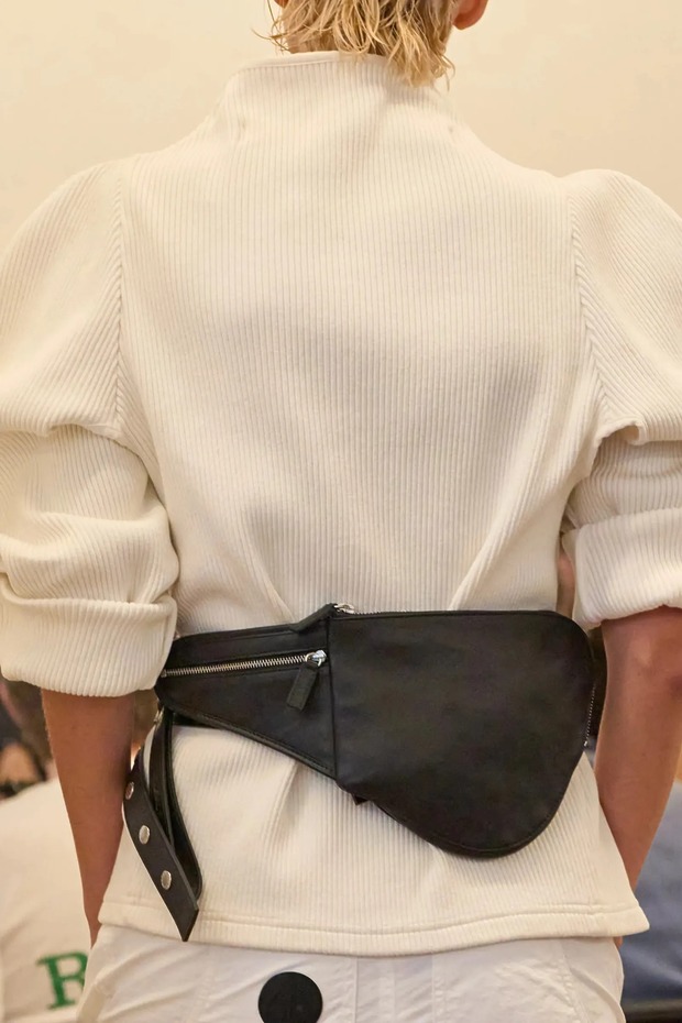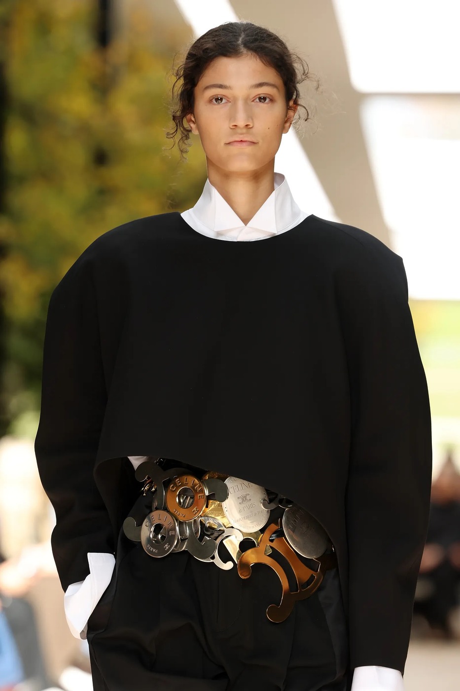아예 가방을 벨트에 부착한 브랜드도 있었죠. 에르메스는 작은 켈리 백을 허리춤에 붙였고요. 코페르니는 휴대폰과 에어팟 케이스를 부착한 벨트를 선보이다가 레이디라이크 톱 핸들 백을 붙여놓았죠. 줄리 케겔스, 에크하우스 라타, 조르지오 아르마니에는 부드러운 범백이 넘쳐났습니다. 그리고 루이 비통은 몬터레이 시계를 부착한 체인 벨트를 선보였는데, 이는 건축가 가에 아울렌티(Gae Aulenti)가 처음 디자인한 1988년 스타일의 시계를 재해석한 것이죠. 마티유 블라지의 샤넬 메티에 다르 쇼에서도 오프닝 룩에 바비타 만다바(Bhavitha Mandava)가 연한 색 청바지에 심플한 밤색 벨트로 룩을 완성했고요.