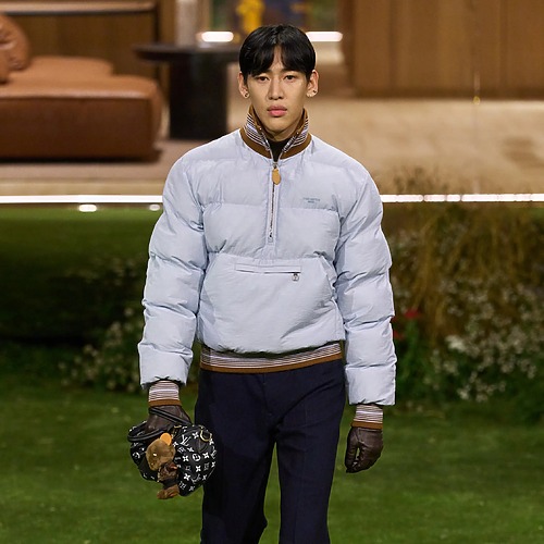 가장 눈에 띈 것은 퍼렐이 수트를 활용한 방식이었습니다. 수트로 연출 가능한 모든 스타일링을 선보였다고 해도 과언이 아니었거든요. 쇼의 시작을 알린 것은 더블 브레스티드 블레이저였습니다. 커다란 라펠, 살짝 들어간 허리 라인 그리고 엉덩이를 덮는 긴 길이까지. 정석적인 디자인의 더블 브레스티드 블레이저였지만, 마냥 익숙하게 느껴지지는 않았습니다. 셔츠 안에 오묘한 색감의 모크넥을 입은 덕분이었죠. 스포티한 나일론 소재의 윈드브레이커로 연출한 믹스 매치도 흥미로웠습니다. 수트를 입을 때 이런저런 규칙에 얽매이지 않아도 좋다는 메시지처럼 보였죠.