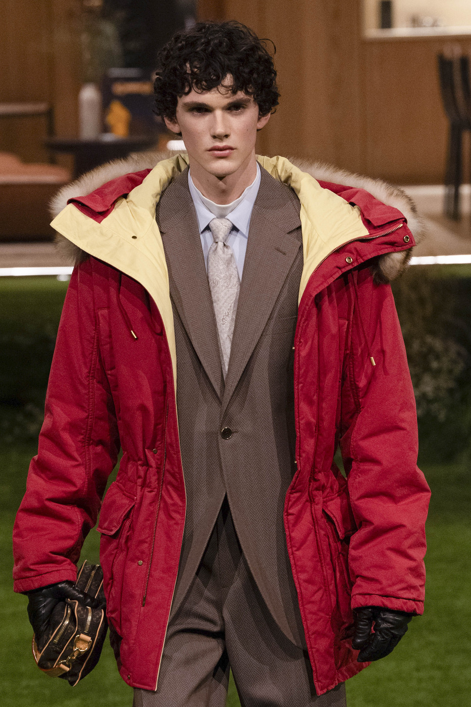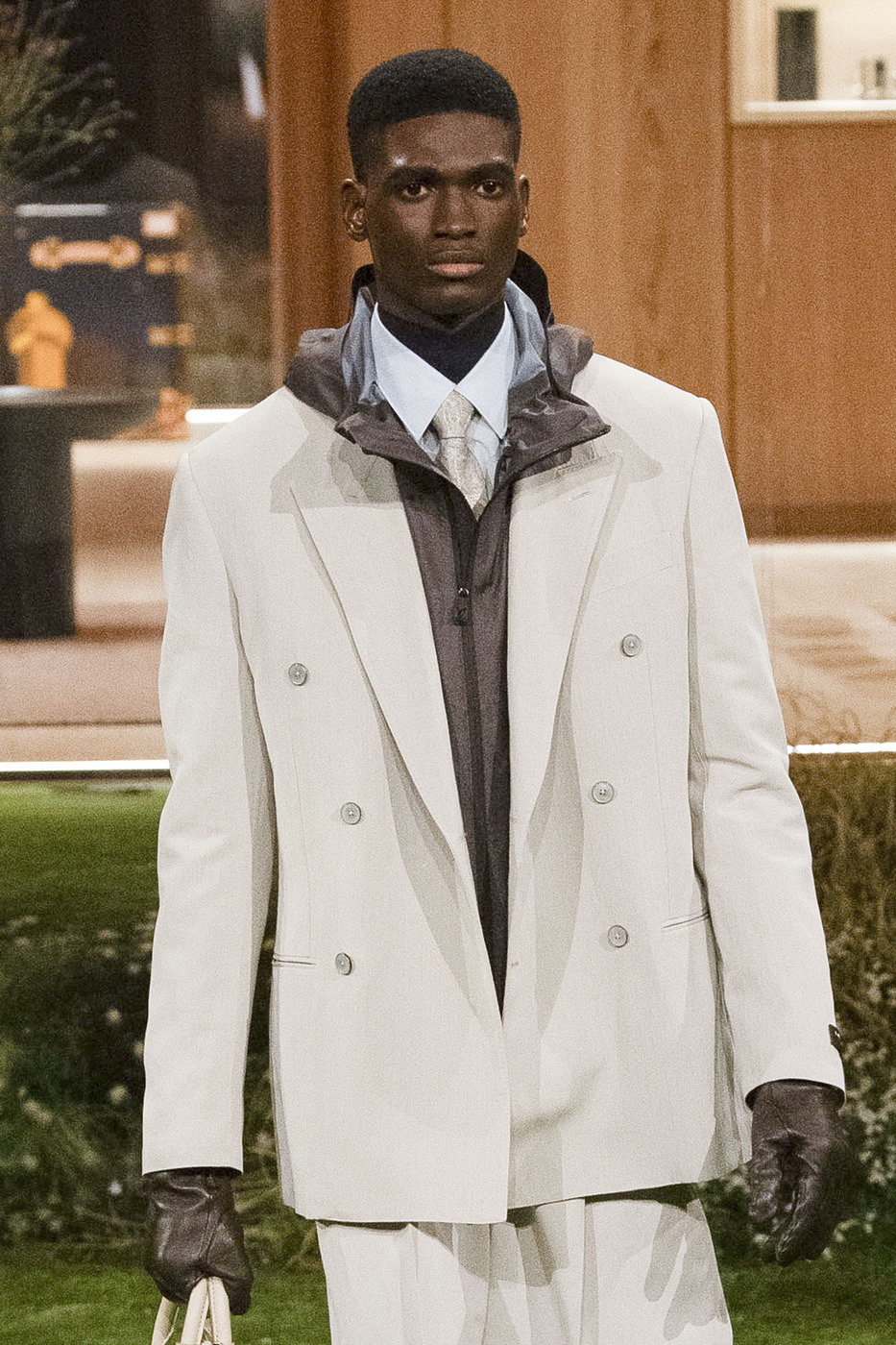 물론 루이 비통의 런웨이에는 더블 브레스티드 말고도 다양한 형태의 블레이저가 등장했습니다. 여유로운 실루엣과 기능성 소재가 돋보였던 스리 버튼 재킷은 더없이 캐주얼한 모습이었죠. 다소 촌스러운 인상을 주던 원 버튼 블레이저가 새롭게 태어난 점도 흥미로웠습니다. 가죽 장갑과 스니커즈, 쨍한 컬러의 셔츠 그리고 반바지처럼 흔히 수트와 짝을 이루지 않는 아이템들을 활용했죠. 우리가 여기서 눈여겨봐야 할 점은, 퍼렐이 대부분의 수트 룩에 모크넥을 매치했다는 사실입니다. 앞으로 수트를 차려입을 때는 이너를 두 개 겹쳐 입는 게 정석으로 자리 잡을지도 모르겠군요.