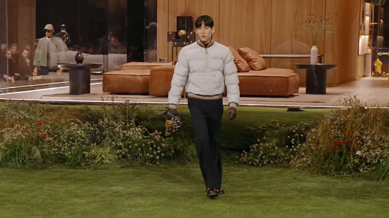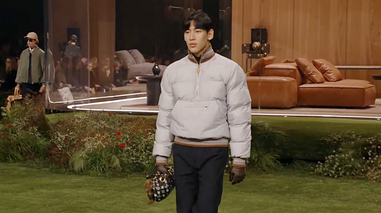 쿼터 집업은 지금 가장 중요한 옷장 필수 아이템으로 떠올랐는데요. 뱀뱀 역시 옅은 푸른색 쿼터 집업 푸퍼 재킷에 블랙 팬츠를 매치해 기능성과 패션 감각을 동시에 뽐냈습니다. 심플하면서도 런웨이에 어울릴 만큼 스타일리시한 룩이었죠. 그는 올해 탄생 130주년을 맞이한 루이 비통 모노그램 패턴의 키폴 반둘리에 백을 들고 스타일을 완성했습니다.