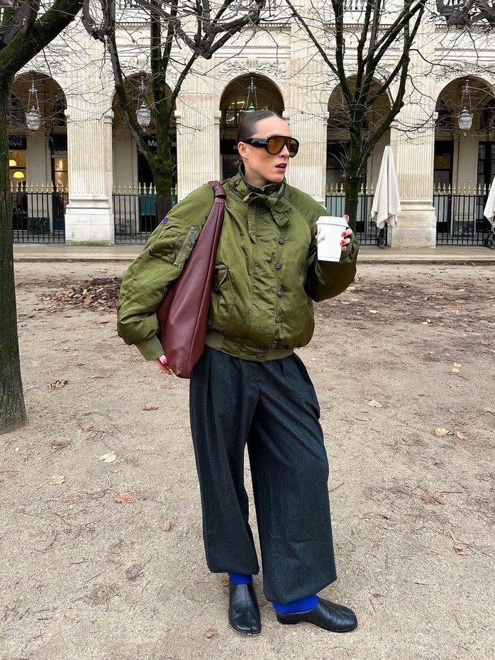 제니도 레더 봄버 재킷과 페일 그린 봄버 재킷을 번갈아 즐겨 입죠. 롱 스커트에 모자까지 따뜻하게 챙겨 쓰니 겨울에도 충분히 활용 가능한 룩으로 보이더군요. 이때 핵심은 하의 선택입니다. 봄버 재킷 특유의 짧은 길이 덕분에 롱 스커트나 와이드 팬츠처럼 볼륨 있는 하의를 매치해도 균형이 무너지지 않습니다. 패딩은 너무 부해 보이고 코트는 괜히 힘준 느낌이 들 때, 봄버는 가장 현실적인 해답이 됩니다. 보온성과 경쾌함을 동시에 챙길 수 있으니까요.