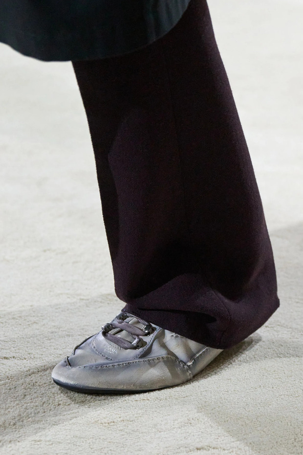 프라다 2026 가을/겨울 남성복 컬렉션은 슬림한 옷으로 가득했습니다. 흥미로운 건, 코트와 팬츠뿐 아니라 신발 역시 마운자로라도 맞은 것처럼 홀쭉한 모습을 하고 있었다는 점이죠. 날렵한 생김새 덕분에 다리에 딱 달라붙는 팬츠와 궁합이 특히 좋습니다. 포멀한 룩을 연출한 뒤, ‘슬림 & 플랫’ 스니커즈로 부드러움을 더해보세요.