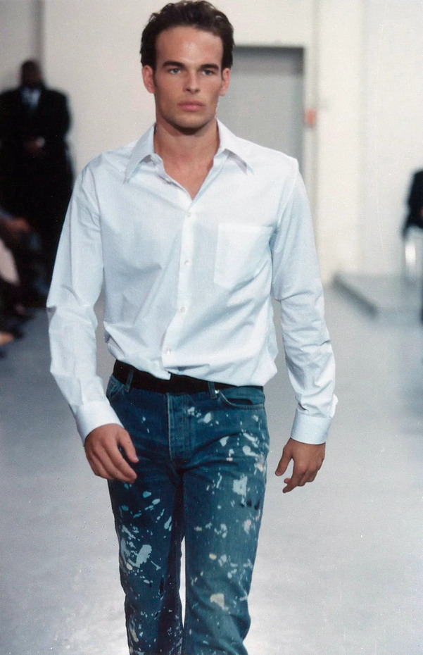 옷에서도 이 흐름은 반복됐습니다. 헬무트 랭은 1998 봄/여름 컬렉션에서 페인트가 튄 데님을 선보였고, 라프 시몬스는 2014 가을/겨울 컬렉션에서 아티스트 스털링 루비(Sterling Ruby)와 협업해 일부러 산성으로 얼룩을 낸 데님을 만들었습니다. 2016 가을/겨울 컬렉션에서 릭 오웬스는 니트 위로 물감이 흘러내린 듯한 연출을 보여줬죠.