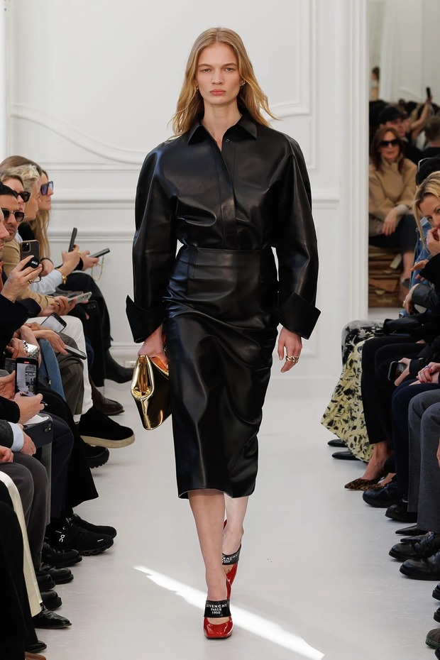 여전히 미니가 부담스러운 이들을 위안 대안도 있습니다. 지방시 2025 가을/겨울 컬렉션에는 무릎까지 오는 레더 펜슬 스커트가 등장했죠. 정교한 테일러링으로 우아한 라인을 뽐냈고요. 2025 가을/겨울 컬렉션에서 토털 재킷 룩을 선보인 루이 비통은 허리 주름을 통해 지방시와 다른 캐주얼한 무드를 만들어냈죠.