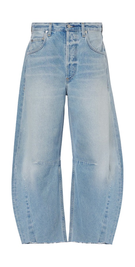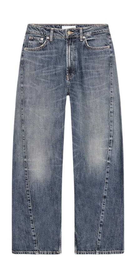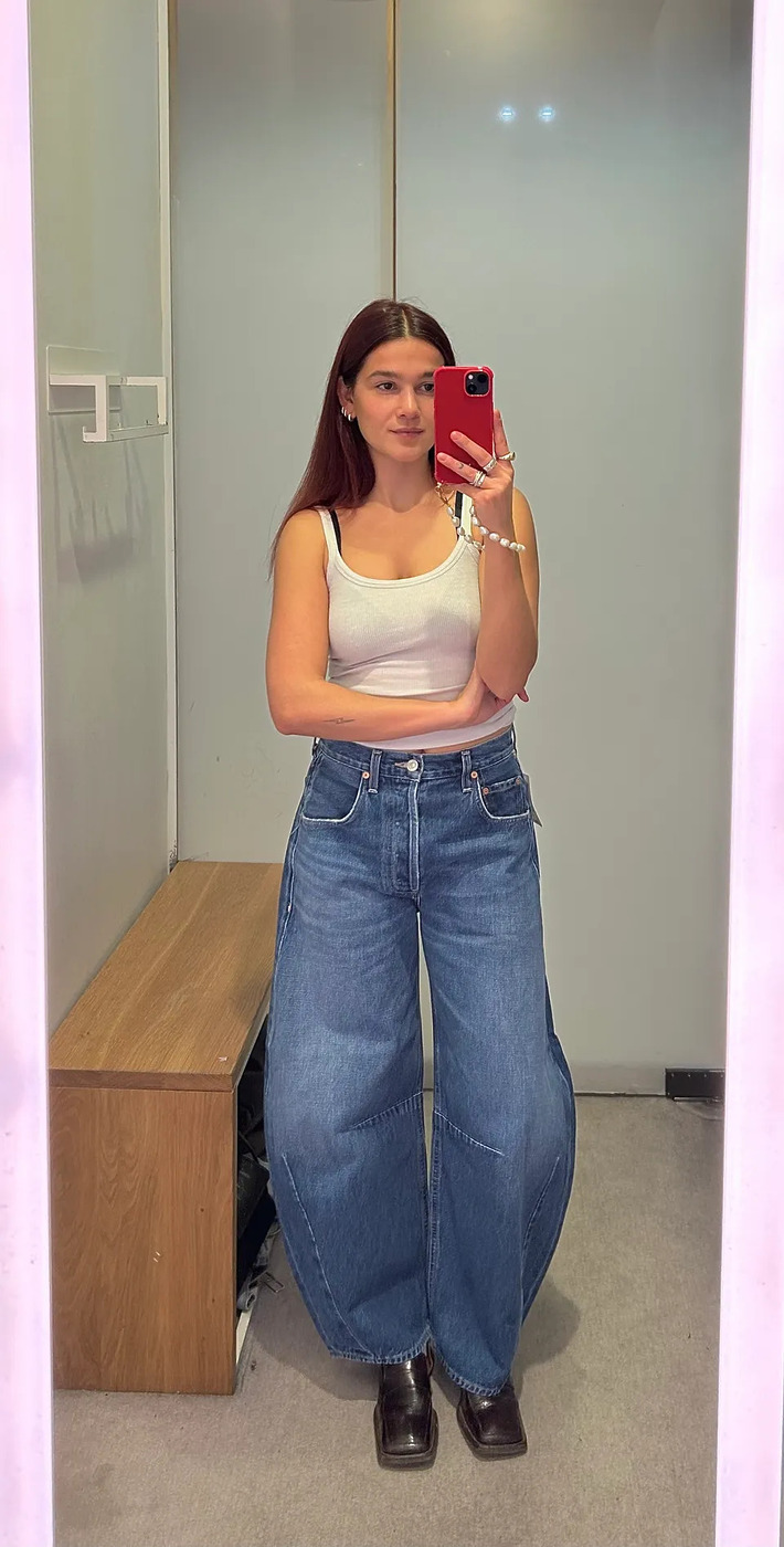 과한 듯 보이지만 실제로 입어보면 균형감이 꽤 좋은 청바지라는 걸 느낄 수 있을 거예요. 풍선처럼 부풀었다가 발목으로 갈수록 정리되는 배럴 진은 생각보다 훨씬 다리가 예뻐 보입니다. 허리는 단단하게 잡아주고 허벅지와 무릎에 여유를 주기 때문에 움직임이 편하고, 자연스럽게 체형을 보완하죠. 하이 웨이스트 디자인이 많아 상의를 짧게 입거나 넣어 입었을 때 실루엣이 더 또렷해집니다. 플랫 슈즈와 매치해도 다리가 짧아 보이지 않고요.