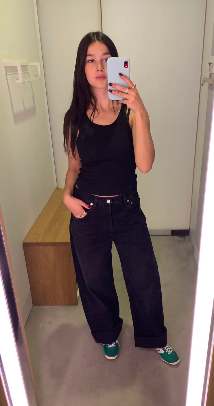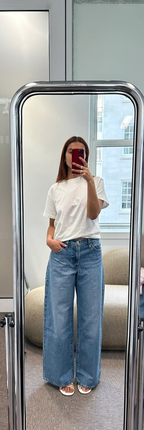 여유롭게 입고 싶다면 로우 라이즈 배기 진을 추천합니다. 엉덩이에 걸치고 다리는 넓고 곧게 떨어지며 쿨한 인상을 주거든요. 저는 리바이스 ‘XL 스트레이트 진’을 평소보다 한 사이즈 크게 입었습니다. 허리선이 자연스럽게 내려가고 골반부터 다리까지 힘을 뺀 실루엣이 단번에 완성되더군요. 길이가 길게 느껴진다면 힐과 매치하세요. 브랜드에 따라 길이 옵션이 다양한 편이라 키에 맞게 고르는 것도 중요합니다. 벨트로 허리를 조여도 좋지만, 오히려 아무것도 하지 않은 채 툭 떨어뜨렸을 때 이 바지의 매력이 가장 잘 살아나죠.