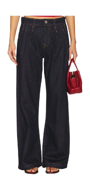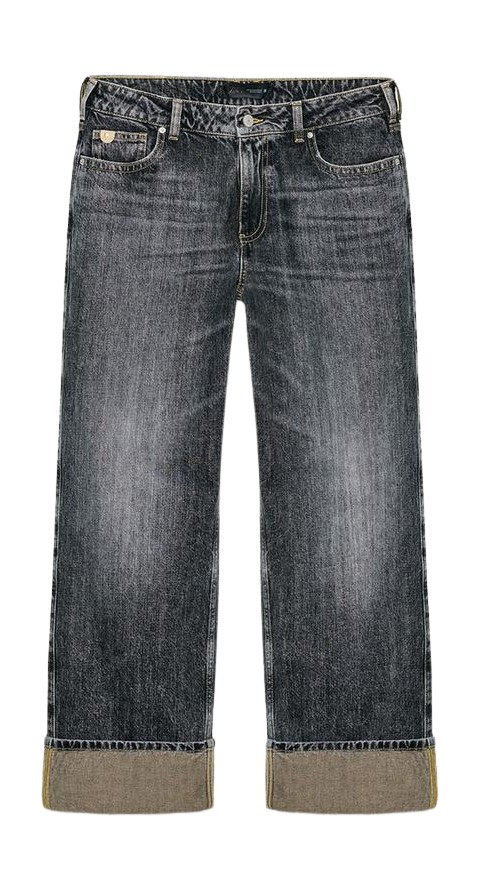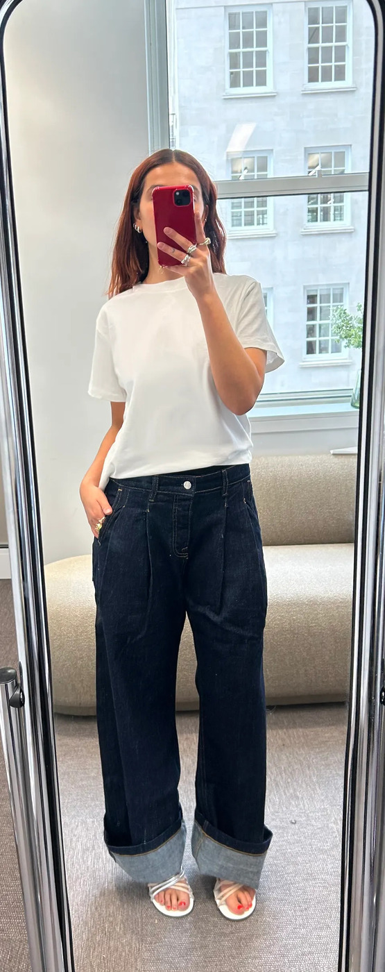 밑단을 접어 올리는 것처럼 앞면에 주름도 넣어보세요. 플리츠 진은 청바지에 테일러드 팬츠 같은 여유를 더해줍니다. 허벅지에 공간이 생기면서 움직임이 편해지고, 다리는 자연스럽게 길어 보이죠. 로우 라이즈 디자인이 많아 처음엔 부담스러울 수 있지만, 실제로 입어보면 생각보다 안정감 있게 걸립니다. 길이가 애매할 경우 롤업해 입어도 어색하지 않아요. 주름 덕분에 오히려 의도한 스타일로 보이죠.