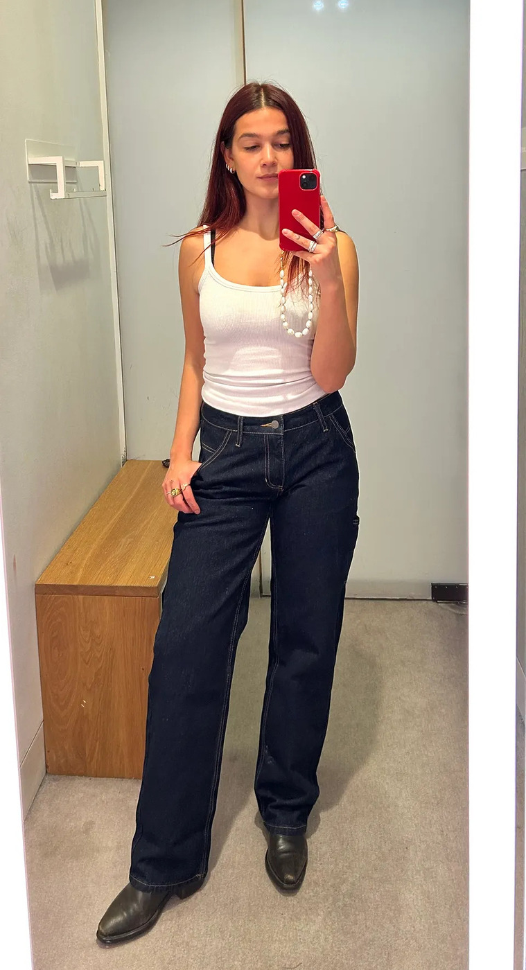 마감이 깔끔한 셀비지 진을 입으면 곧바로 분위기가 단정해집니다. 과하게 워싱된 데님보다 훨씬 정제된 인상을 주면서도, 입을수록 몸에 맞게 길들이는 재미가 있죠. 저는 게스 ‘오리지널 카펜터 와이드 레그 데님 진’을 입었는데 미드 라이즈에 스트레이트로 떨어져 데일리로 입기 딱 좋더군요. 탄탄한 원단 덕에 골반과 엉덩이 라인을 예쁘게 잡아주는 것이 인상적이었고, 캐주얼하면서도 어딘가 갖춰 입은 느낌을 주고 싶을 때 입을 계획입니다.