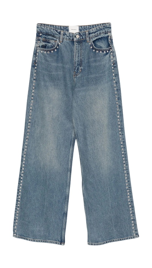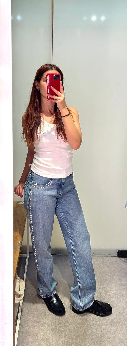아예 포인트가 되는 장식을 더해도 됩니다. 낮에는 셔츠와 로퍼로 차분하게, 저녁에는 탱크 톱과 키튼 힐로 분위기를 바꾸는 거죠. 장식이 들어간 만큼 실루엣은 최대한 단순하게 뚝 떨어지는 걸로 골라보세요. 저는 리포메이션 ‘캐리 하이라이즈 슬라우치 와이드 레그 진’을 입었습니다. 한 사이즈 크게 입었더니 핏도 원하는 대로 뚝 떨어지고 움직이기도 편하더군요. 스티치 라인을 따라 배치된 스터드 덕분에 부담스럽지 않고, 데일리 룩에 적당한 재미도 더해줍니다.