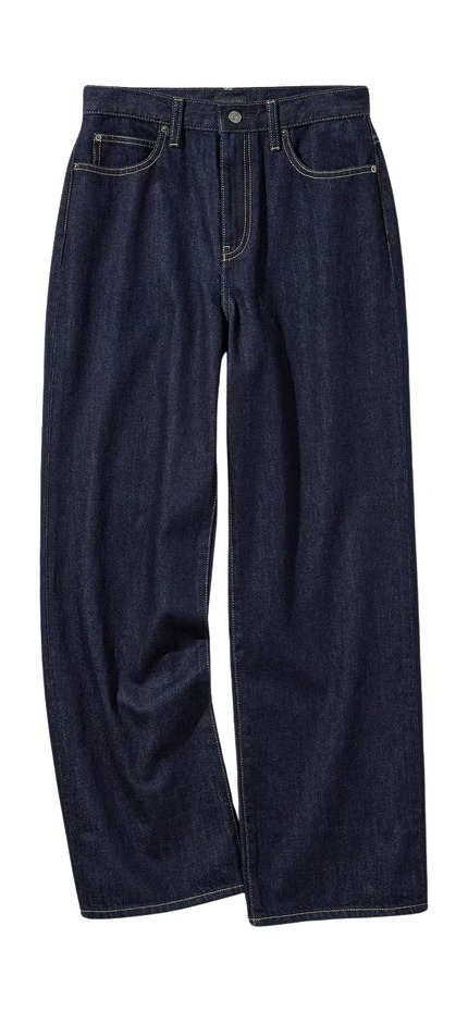 기본이죠. 과하게 넓지도, 답답하게 붙지도 않는 스트레이트 진은 다리가 곧게 떨어지면서 전체적인 비율을 안정적으로 잡아줍니다. 제가 입은 유니클로 ‘와이드 스트레이트 진’은 배꼽 아래쯤부터 시작해 엉덩이를 부드럽게 감싸고, 허벅지부터는 여유를 두고 내려오는 핏이더군요. 정사이즈로 입으면 단정한 인상이 강해지고, 한 사이즈 업하면 힙라인이 살아 있으면서 편안함이 느껴집니다. 청바지를 처음 고를 때나 어떤 상의에도 실패 없이 입고 싶을 때 가장 안전한 선택지입니다.