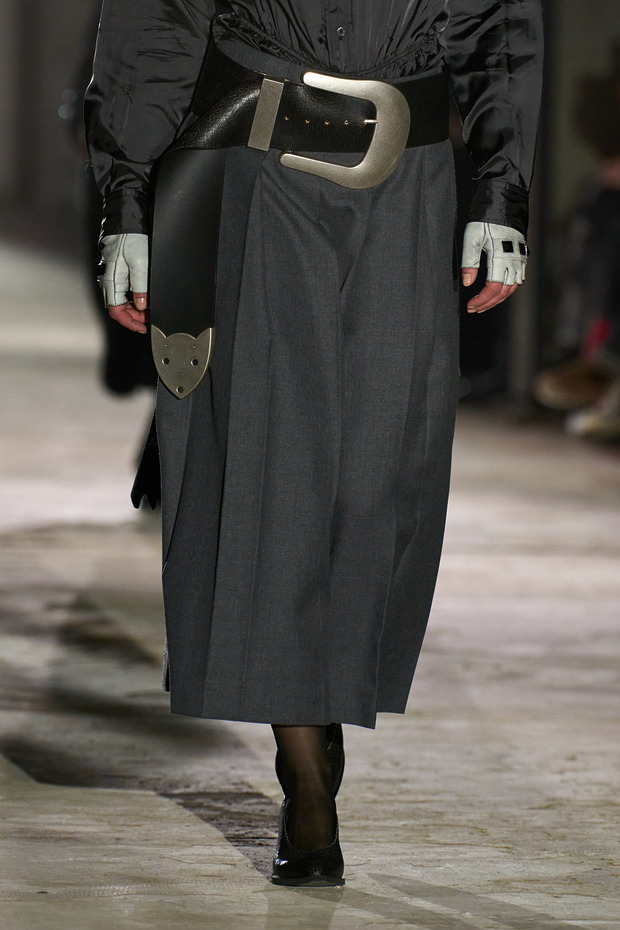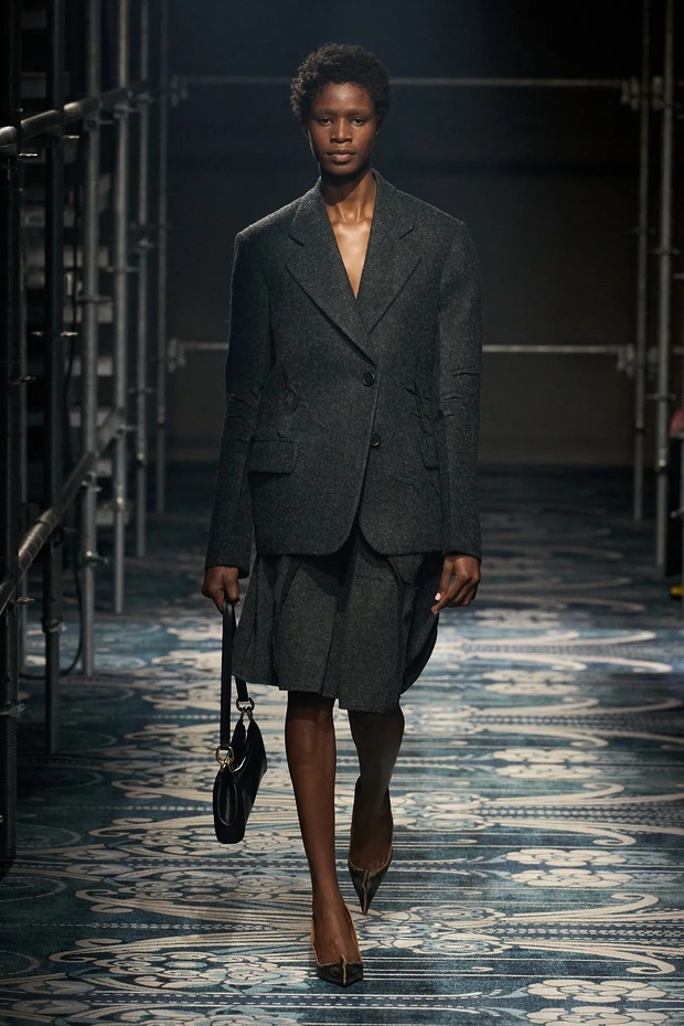 2025 가을/겨울 런웨이에도 그레이 스커트는 어디에나 있었습니다. 프라다의 구겨지고 잘리고 해체된 버전부터 바퀘라의 오버사이즈 플리츠에 버클 벨트를 맨 뒤 실크 셔츠를 매치한 버전까지 다양했죠. 비비안 웨스트우드는 그 명성 그대로 펑크적인 트위스트를 선보였는데, 한쪽을 잘라 다리를 드러내는 것을 선택했죠.