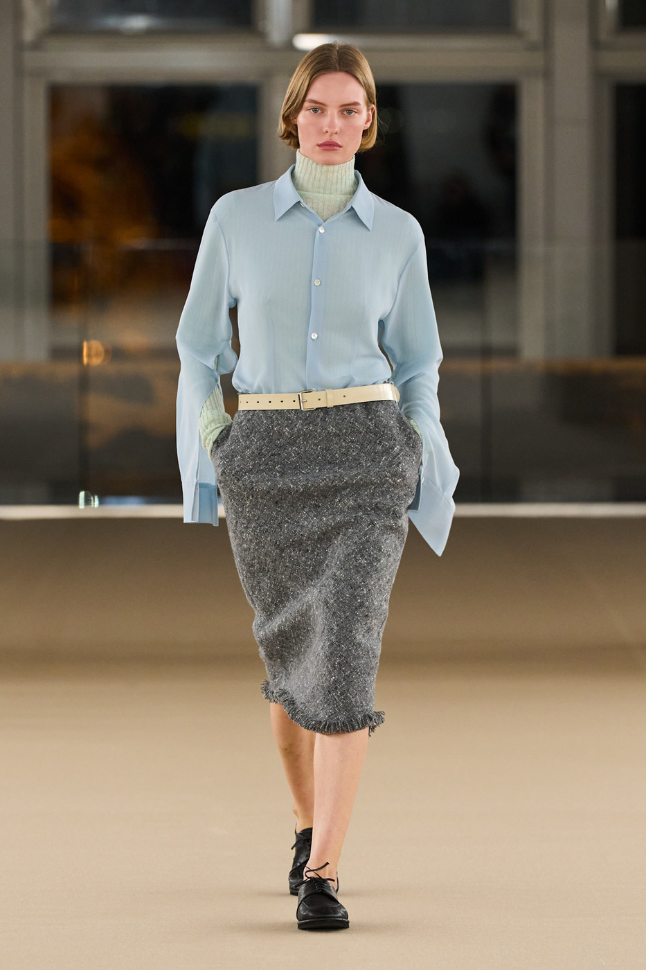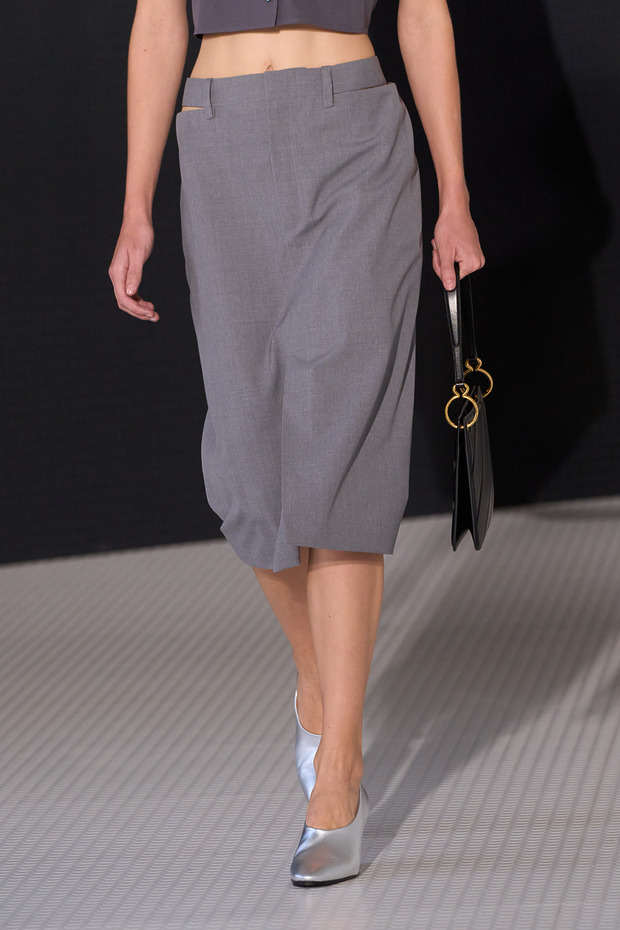 2026 봄/여름 컬렉션에서도 이 스커트의 지속력을 확인했습니다. 특히 마티유 블라지가 재해석한 샤넬의 그레이 울 펜슬 스커트는 이미 여러 사람의 위시 리스트에 올랐죠. 금빛 버튼으로 한쪽을 고정한 로우 라이즈 스타일 스커트는 크롭트 재킷에 매치한 뒤 얇은 벨트로 마무리해 그간 샤넬에서는 볼 수 없던 매력적인 셋업을 완성했습니다. 그 밖에 베트멍, 펜디, 질 샌더에서도 슬림한 실루엣의 밝은 그레이 스커트가 등장했죠.