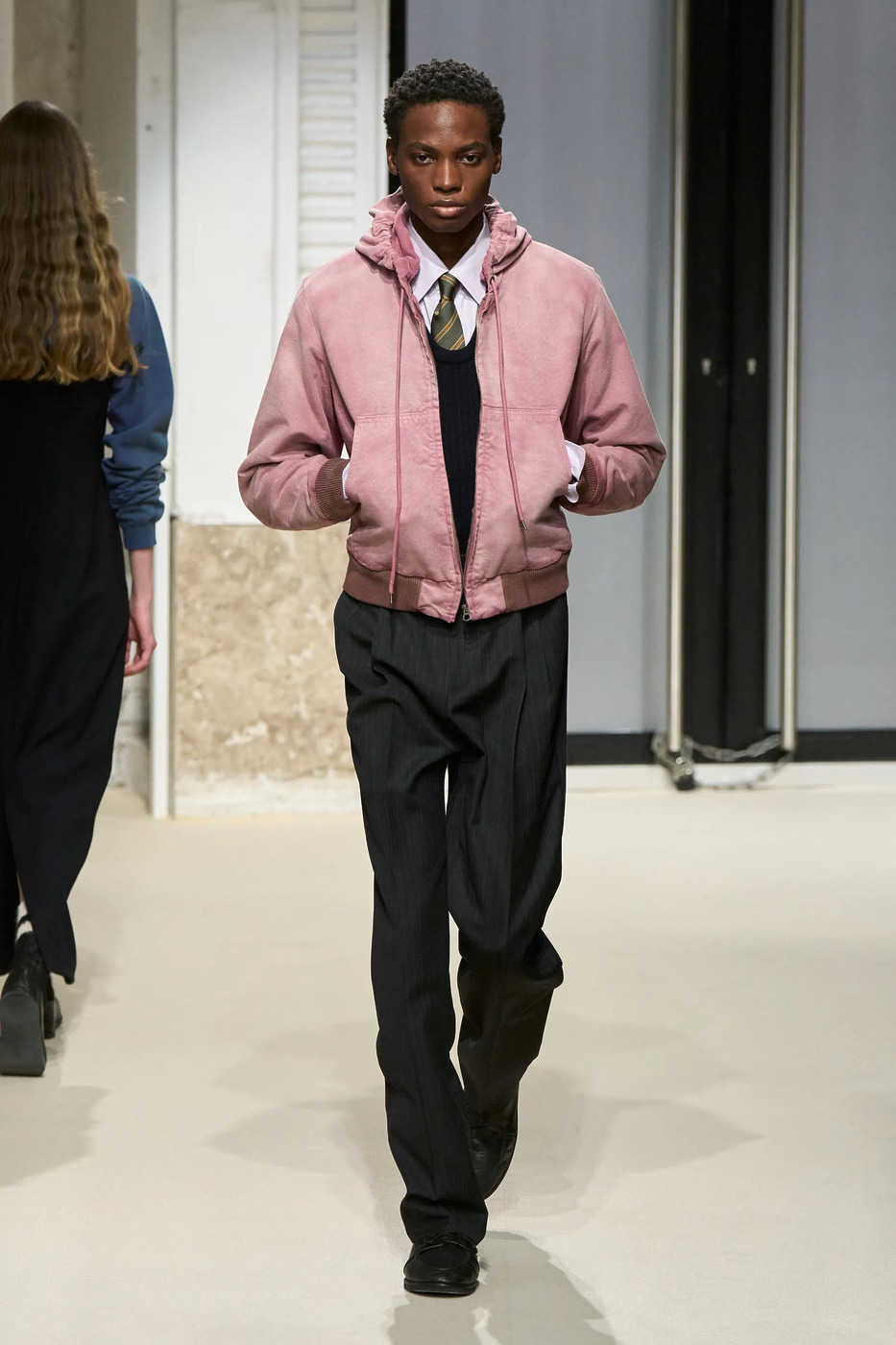 핑크로 캐주얼한 분위기를 자아내는 방법은? 단순하게 핑크색 후디를 걸치기만 하면 끝입니다. 연청 데님 팬츠와의 궁합은 말할 것도 없고, 핑크색이 시선을 사로잡는 컬러니만큼 믹스 매치를 연출하기도 수월하죠. 오라리는 네크라인이 깊게 파인 니트, 셔츠, 타이 그리고 수트 팬츠를 활용한 비즈니스 룩에 핑크색 후디를 더했군요. ‘블랙&핑크’가 얼마나 효과적인 컬러 조합인지 다시 한번 느낄 수 있죠?